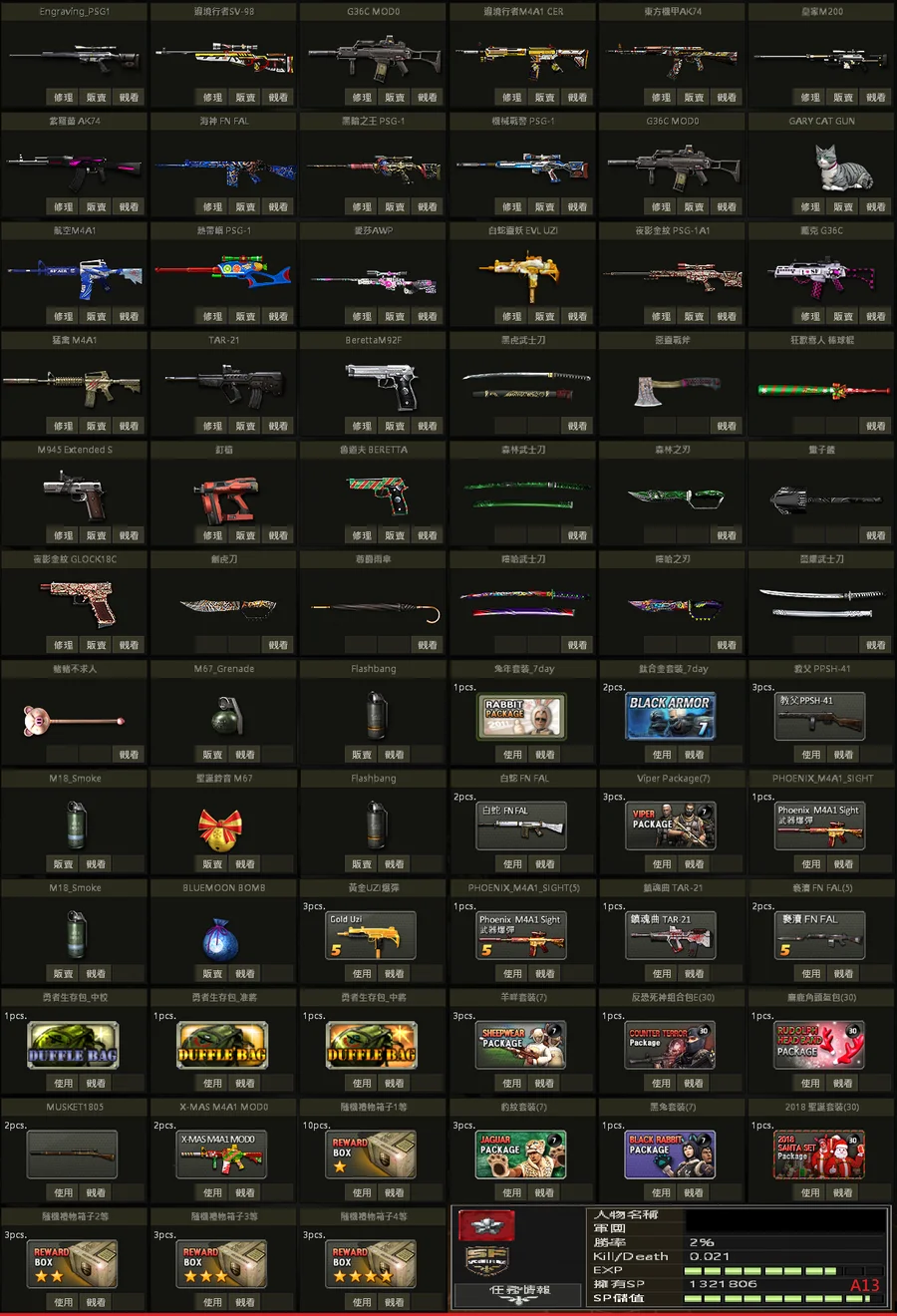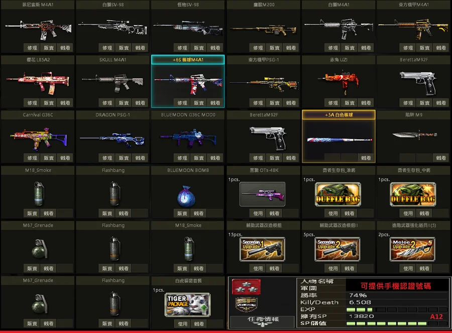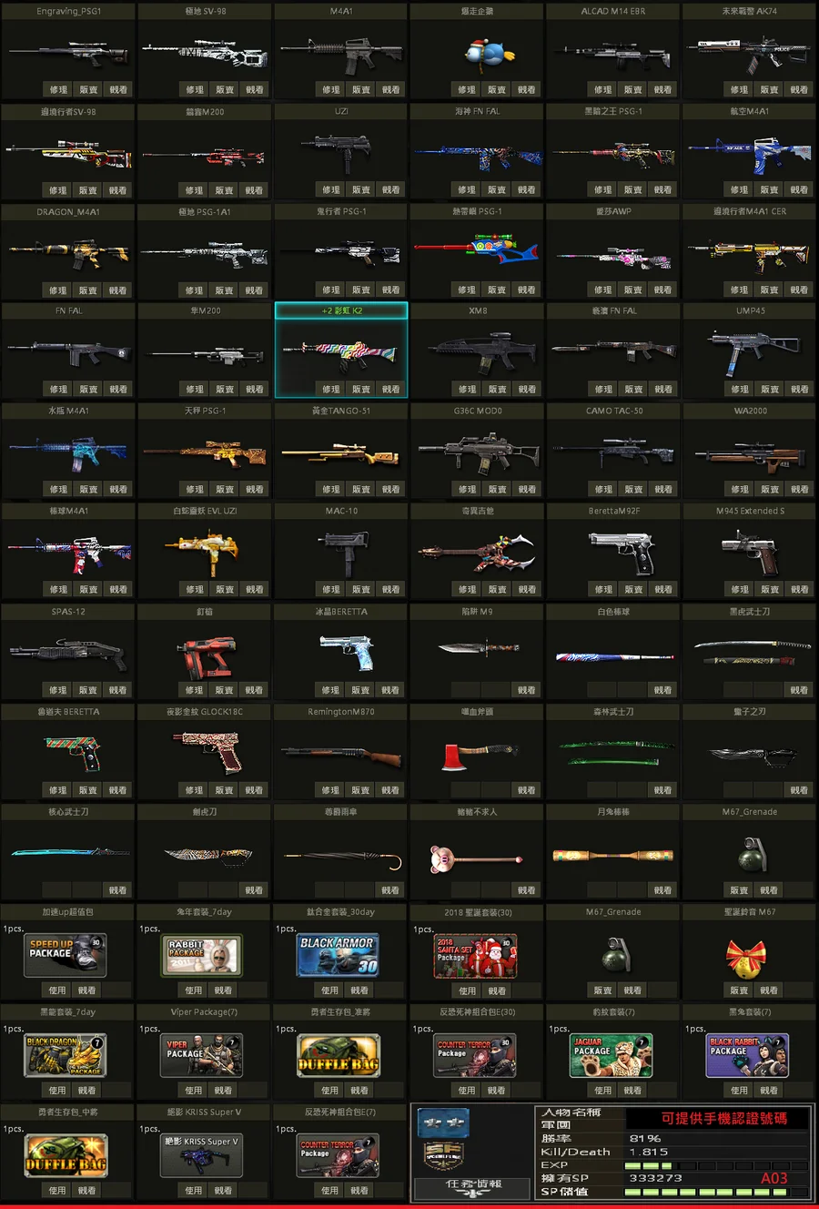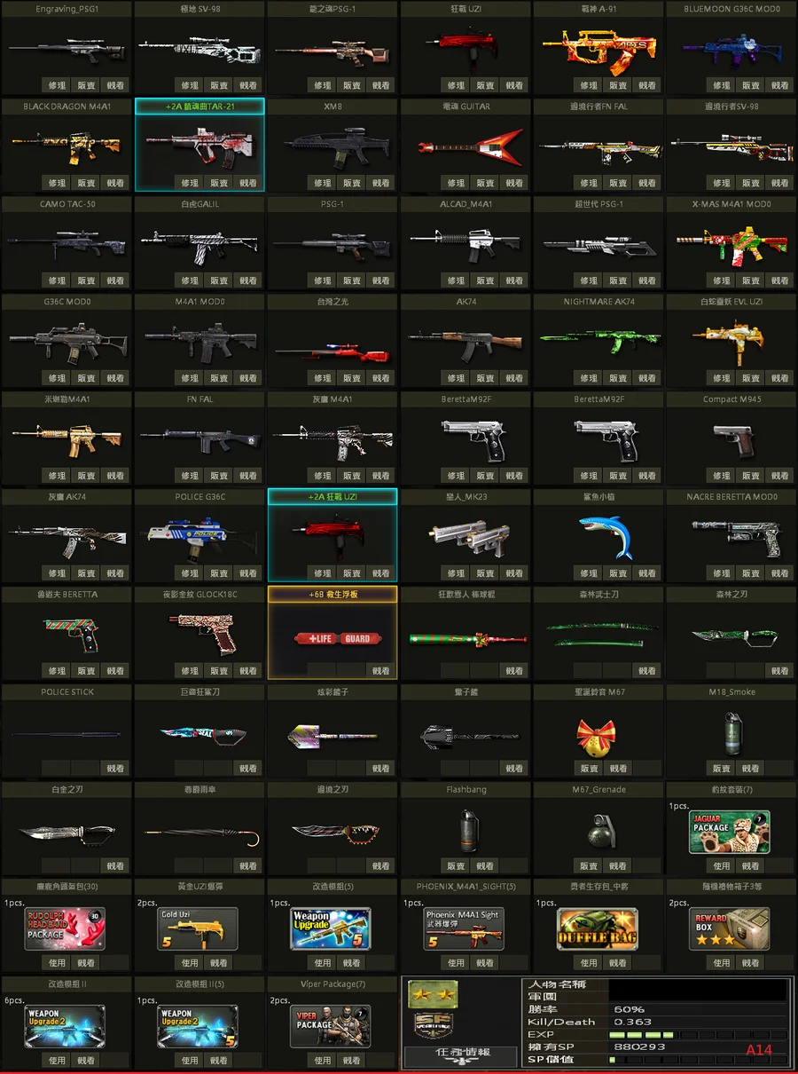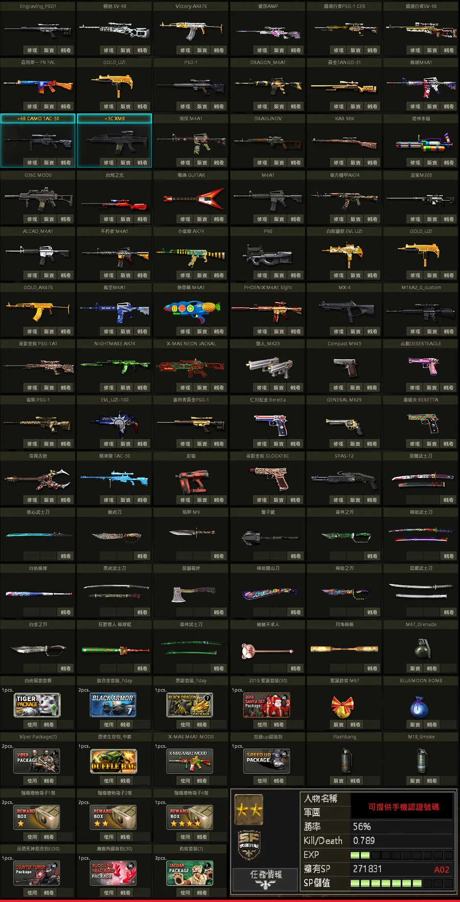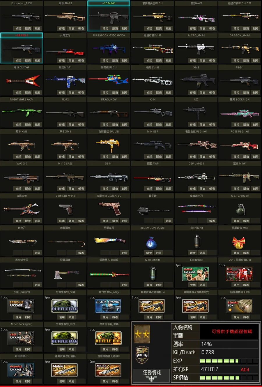 二星棕、白金P、黃金P、邊境SV、極地SV、金龍M、不朽者M、極凍狼TAC、百年U、白蛇U、格林水槍、武士刀、白金刃