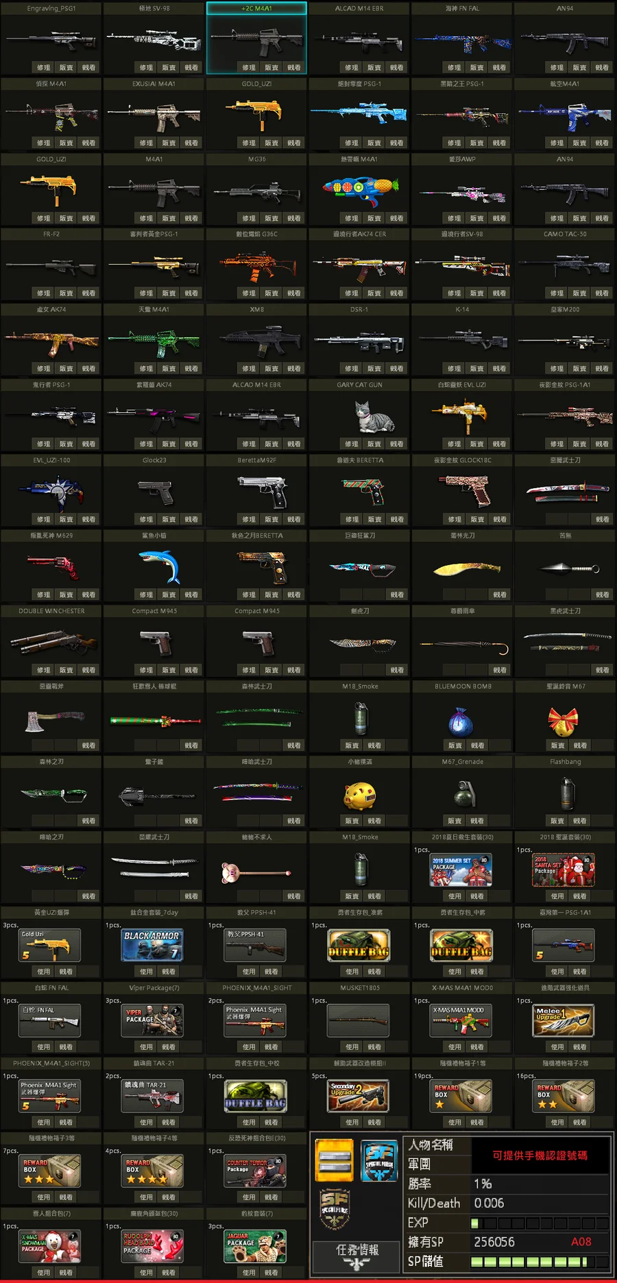 二星黃、榮耀XM8、白金P、黃金P、機器人SV、邊境SV、金龍M、沙漠M、黃金SVD、動物灰貓、十款刀款