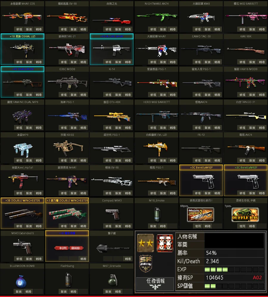 二星棕、永恆M、鎮邪M、韓國M、鳳凰SV、極地SV、超世代P、戰馬P、蓋亞OTs、韓國XM8、饑荒MP9、冰晶MP9、白蛇U、貴族U