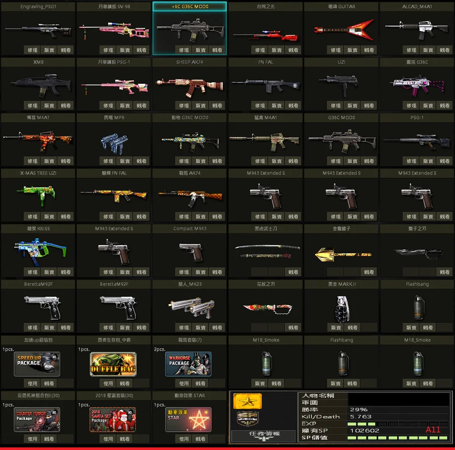 一星黃、白金P、月華P、月華SV、白金M、楓葉M、閃電MP9、武士刀、金蠍鏟、鳳梨