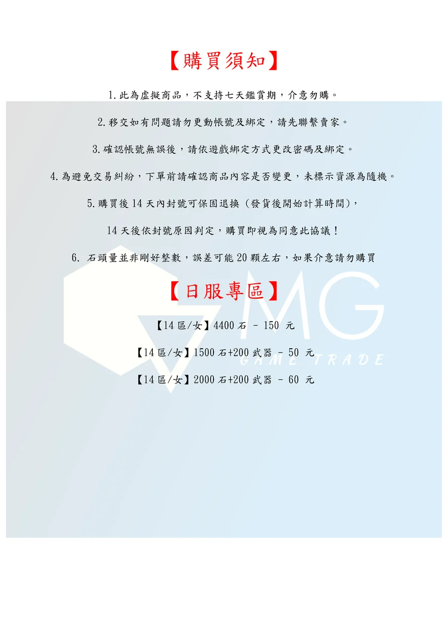 14天後依封號原因判定,購買即視為同意此協議!