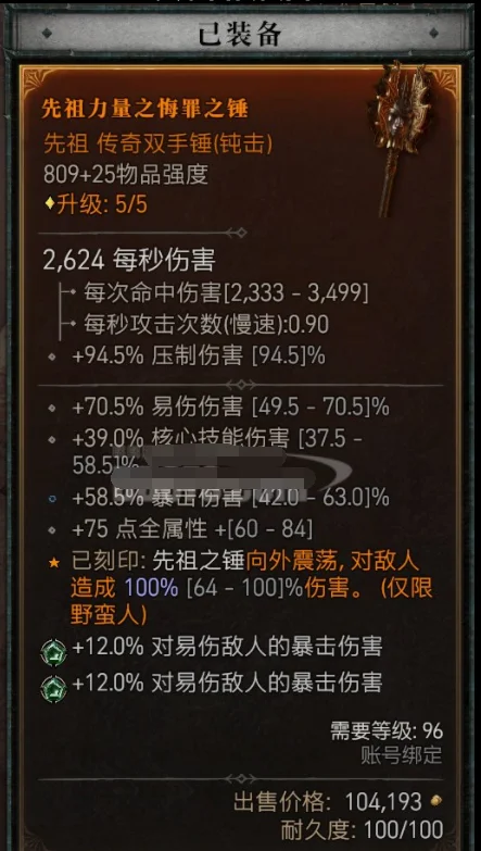100級旋風先祖雙bd畢業野蠻人,聲望全滿核心雕紋全21級,單刷80以下無壓力