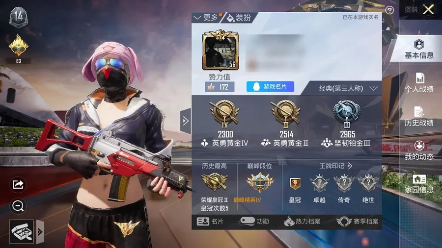描述:QQ有一個皇冠兩個太陽97級 吃雞:有S1戰斗服和身法口罩和身法鞋子,有五爪金龍降落傘和環太平洋撬棍 王者:有六個傳說皮v8,其他皮膚有很多,整體來說這是個連體,都可2次識別,圖片為標準詳細的可問我
