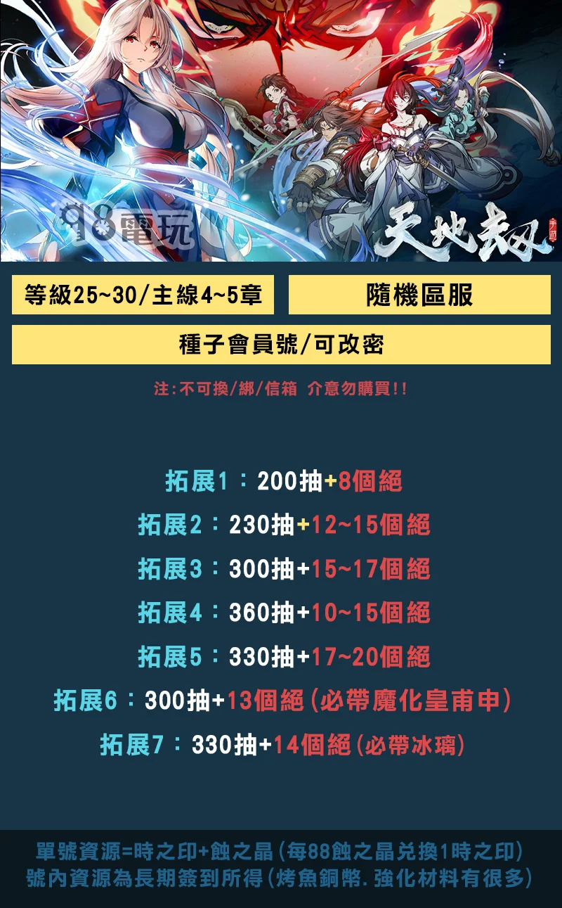 2.該帳號僅保證圖片上所標示或即時通訊討論後,所需的角色&資源,除非保證物品有缺失,否則不予退款。