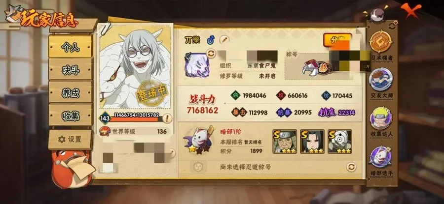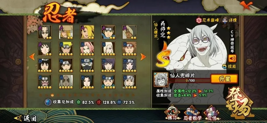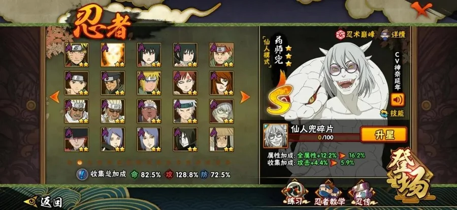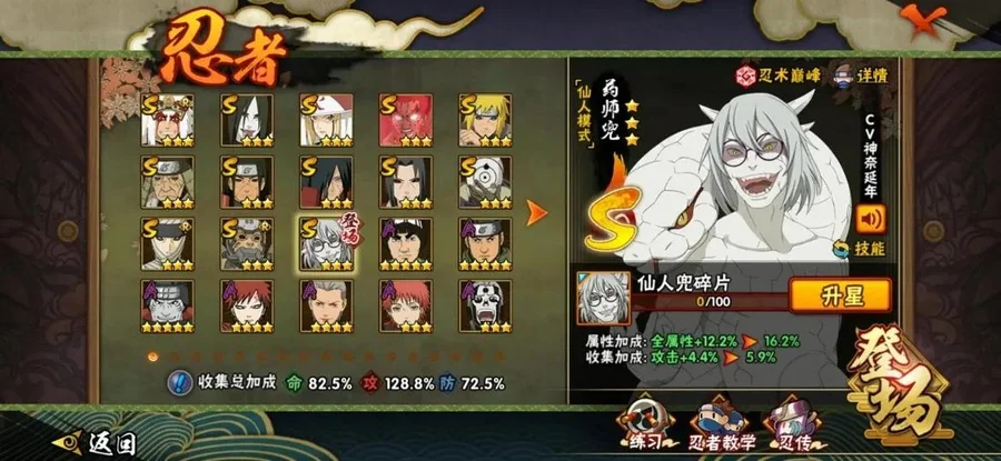 S忍:宇智波斑·白面具 半藏·穢土轉生 死門·邁特凱 大蛇丸 波風水門·穢土轉生 猿飛日斬·穢土轉生 無·二代目土影 藥師兜·仙人模式 宇智波鼬·穢土轉生 千手柱間·穢土轉生 自來也·舞之豪杰 綱手·百豪