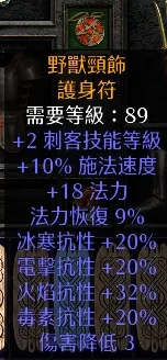 項鍊:2刺客10高施18法力20全抗32火抗(89級)230