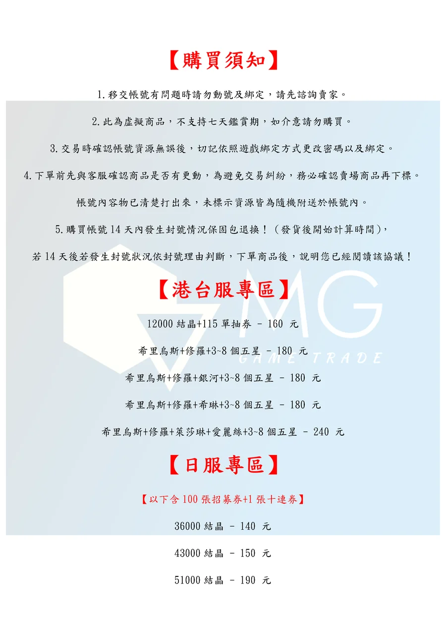 3.交易時確認帳號資源無誤後,切記依照遊戲綁定方式更改密碼以及綁定。