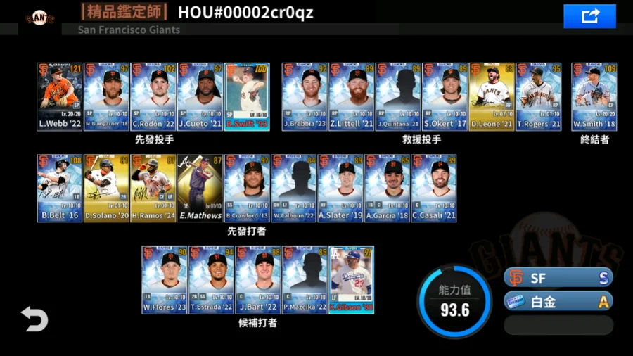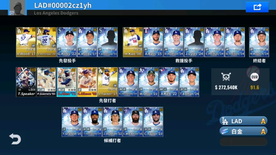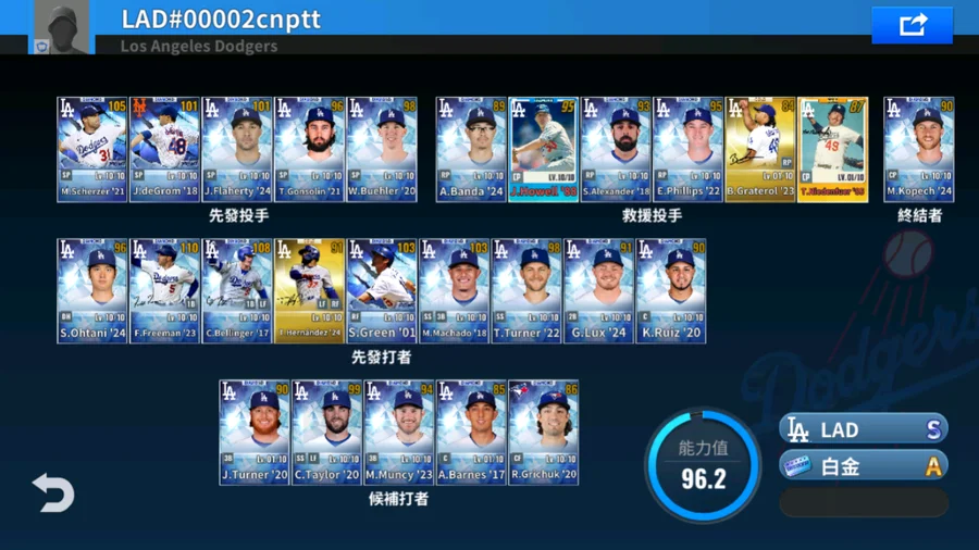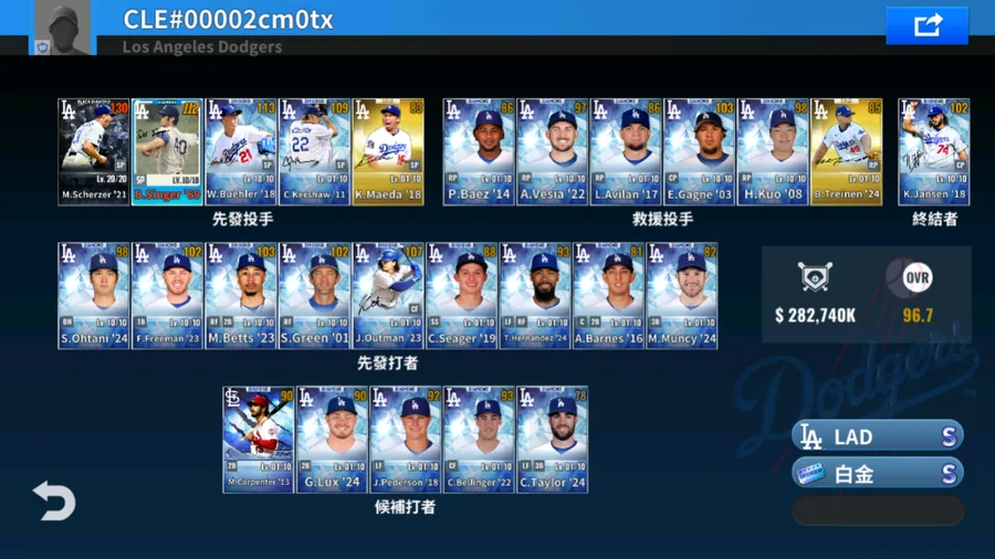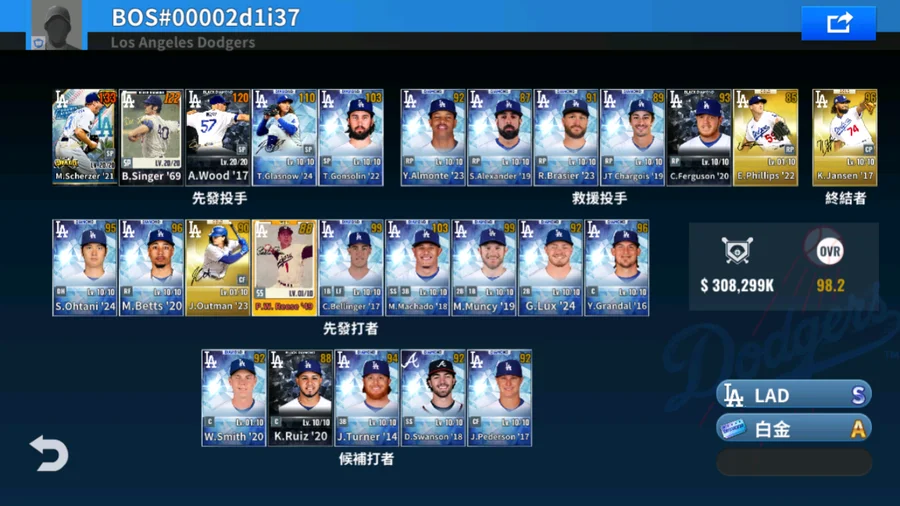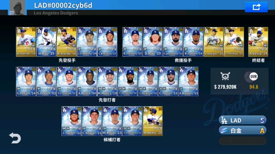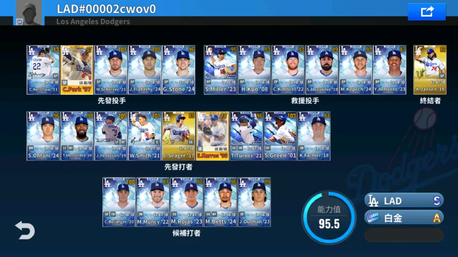21 M.Scherzer黑鑽簽+16 J.Pederson金簽+20 M.Betts金簽+85 T.Niedenfuer金簽+53 D.Snider金簽+85 P.Guerrero金簽+21 B.Treinen金簽+24 A.Vesia金簽+15 K.Jansen金簽+1升階 5000