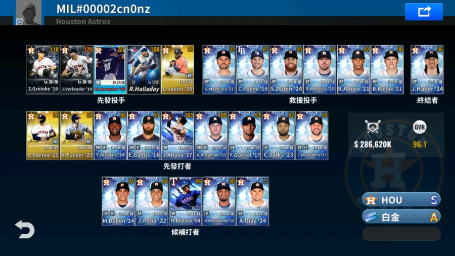 99 M.Hampton白金簽+19 Z.Greinke黑鑽簽+21 C.Correa金簽+20 C.Javier 金簽+23 K.Tucker金簽+18 J.Verlander金簽+19 J.Verlander黑鑽簽+卓越白金 R.Halladay 4000