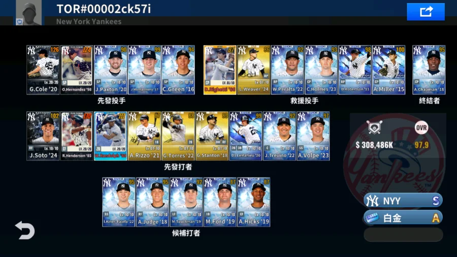98 O.Hernandez黑鑽簽+20 G.Cole黑鑽簽+85 R.Henderson黑鑽簽+86 D.Righetti金簽+80 W.Randolph白金簽+21 A.Rizzo金簽+24 L.Weaver金簽+18 G.Stanton金簽+22 G.Torres金簽 5000