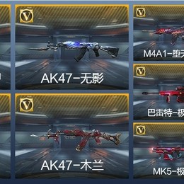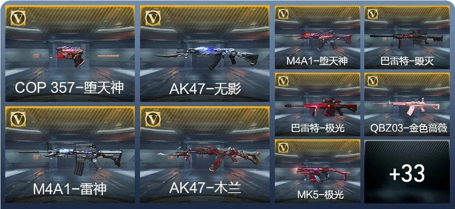 唐刀-大唐榮耀,KSG-火力競放,AK47-無影,沙鷹-飛電,M4A1-雷神,M4A1-龍血,QBZ03-金色薔薇,AN94-超新星,CZS2-心動次元覺醒,M4A1-櫻龍·超覺,叢林匕首-火力競放,AK47-華夏傳說,09式狙-天神,SCAR-探星者,血月,沙鷹-修羅,馬來劍-毀滅,百戰巾幗槍,AK47-木蘭,神罰戰斧,地獄火,AK47-血武士,血陽,拳魔小巨獸,蟒蛇-火力競放,巴雷特-毀滅,USP-神罰,龍嘯,AK47-黑鯊,麒麟刺-墮天神,9A91-天神,M4A1-墮天神,湯姆遜-烈龍,MK5-極光,加特林-蟒蛇,改裝GLOCK-木蘭,黑騎士手雷,巴雷特-極光,COP 357-墮天神,M4A1-運輸船,M200-心動次元覺醒