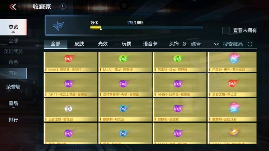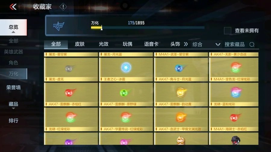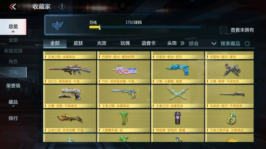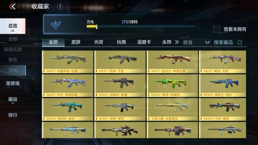 唐刀-大唐榮耀,M4A1-遊騎兵-香香,SCAR-幽暗騎士,叢林匕首-慶龍覺醒,巴雷特-冬滅覺醒,P90-突突兔覺醒,MK47-機械紀元,AK47-死神,擎天,地獄烈櫻·超覺,耀金雷刃,M4A1-千變,AK47-木蘭,SR25-燃燒泰坦,M4A1-雷霆,火麒麟煙霧彈,M4A1-心動次元覺醒,AK47-雷麒麟,火麒麟手雷,巴雷特-毀滅,M4A1-遊騎兵,AK47-孟德,黑騎士煙霧彈,燃燒彈-遊騎兵,巴雷特-極光,火麒麟閃光彈,M4A1-運輸船,尼泊爾-火麒麟,巴雷特-極光-運動寶貝蘭,閃光彈-遊騎兵,M4A1-龍血,AK47-奉先,AWM-天使,沙鷹-火麒麟,09式狙-天神,血月,馬來劍-毀滅,神罰戰斧,星芒,AK47-血武士,KSG-黑騎士,尼泊爾-雷霆,M4A1-星象,AK47-黑鯊,AK47-Rush-星速,M4A1-獵神,黑騎士手雷,COP 357-墮天神,柯爾特-仲達
