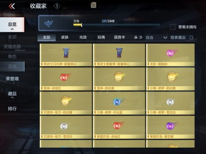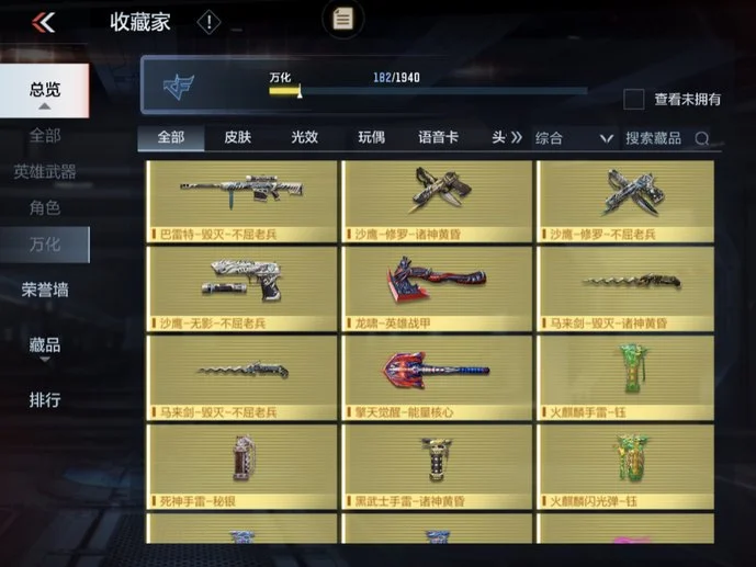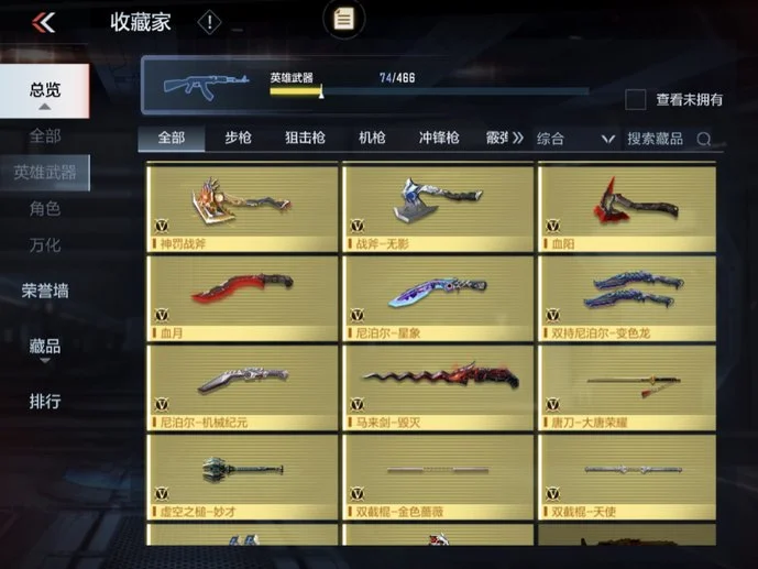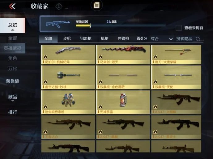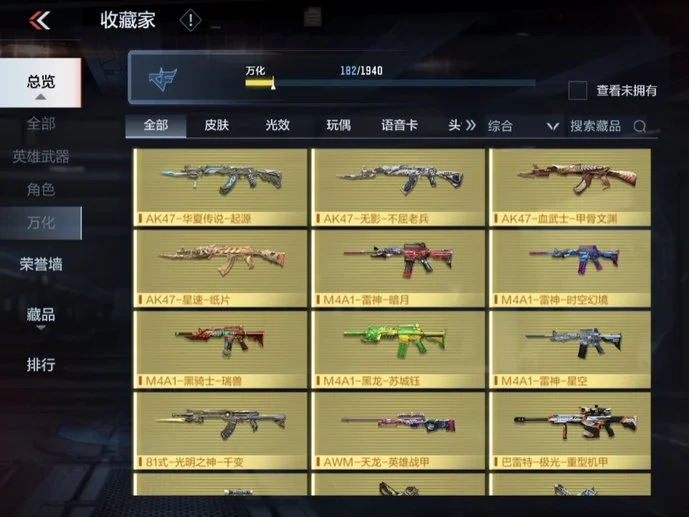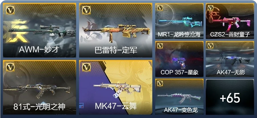 唐刀-大唐榮耀,M4A1-黑騎士,雙截棍-天使,COP 357-星象,QSZ92-金色薔薇,劍齒虎,CZS2-心動次元覺醒,81式-光明之神,QSZ92-天使,雙持沙鷹-變色龍,迷你究極泰坦,雙持斯泰爾-天使,雙截棍-金色薔薇,AK47-華夏傳說,地獄烈炎,巴雷特-定軍,戰斧-無影,AK47-沙漠郡主-超覺,地獄火,死神手雷,AWM-天龍,RPK-美杜莎,98K-血月,尼泊爾-星象,CZS2-善財童子,98K-黑騎士,AK47-雷麒麟,巴雷特-毀滅,USP-神罰,蟒蛇-妙才,巴雷特-變色龍,M4A1-玫瑰精靈,毀滅征服者-超越Max,虛空之槌-妙才,白骨利刃,M4A1-墮天神,MK5-極光,巴雷特-極光,尼泊爾-機械紀元,M4A1-運輸船,AK47-無影,沙鷹-飛電,M4A1-雷神,M4A1-龍血,AUG-機械紀元,M4A1-死神,加特林-堡壘,M4A1-櫻龍·一覺,加特林-堡壘覺醒,沙鷹-無影,M4A1-心動次元,血月,沙鷹-修羅,馬來劍-毀滅,沙鷹-冰鋒覺醒,AK47-變色龍,墨刃-幻神,神罰戰斧,AK47-血武士,MK47-雲舞,血陽,M4A1-海騎士,雙持尼泊爾-變色龍,RPK-赤炎盤龍,AWM-妙才,龍嘯,MK23-幻神,M4A1-賽博雷神,湯姆遜-烈龍,M4A1-臥龍,暗殺神,QBZ03-死神,MR1-龍吟驚滄海,M200-心動次元覺醒