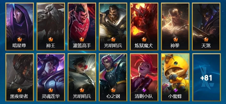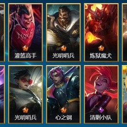 古拉加斯-碎桶者,努努和威朗普-髒兮兮,賈克斯-光明騎士,慎-腥紅之月 鬼武者,迦娜-暴風女神,布蘭德-蒼穹之光,崔斯特-王牌艦長,拉克絲-戰鬥學院,墨菲特-無畏號,希瓦娜-冰霜亞龍,雷克頓-枯萎之壤,格雷福斯-泳池派對,亞託克斯-霸天劍魔,德萊厄斯-神王,古拉加斯-飛車暴走族,劫-天煞,內瑟斯-單身貴族,迦娜-魅惑女巫,亞索-戰場之王,李青-NOVA 天賦覺醒,格雷福斯-光明哨兵,艾瑞莉婭-西部天使,奧莉安娜-光耀之心,伊芙琳-緋金魅影,艾克-探夢奇旅,安妮-小紅帽,菲奧娜-緋金麗刃,亞索-靈魂蓮華,燼-暗星尊,亞索-黑夜使者,錘石-盜夢暗影,阿狸-幻夢甜心,劫-靈能特工,奧拉夫-王牌勇將,賽娜-星之守護者,內瑟斯-煉獄魔犬,卡莎-神龍尊者 玉境靈龍,蕾歐娜-戰鬥學院,慎-未來戰士,德萊文-靈魂收割者,拉莫斯-熔火之心,希瓦娜-黯黑魔龍,賽恩-戰爭機器,韋魯斯-迅箭,厄運小姐-西部牛仔,阿利斯塔-哞利斯塔,卡莎-電玩女神,雷恩加爾-雷喵喵爾,凱南-超武乾坤:電弧,菲奧娜-皇家守衛,吉格斯-兔寶寶,潘森-獵龍勇士,亞索-西部牛仔,傑斯-神奇先驅,艾希-王牌司令,劫-衝擊之刃,凱特琳-鐵血狙擊手,薇恩-光明哨兵,奧拉夫-獵龍勇士,金克絲-光耀之芒,亞索-源計劃:風,凱南-奈落之炎,艾希-黑暗騎士,菲茲-兔寶寶,雷克頓-鱷霸,娜美-緋金鮫靈,蓋倫-鋼鐵軍團,璐璐-光耀之靈,庫奇-海牛騎手,阿狸-偶像歌手,阿卡麗-銀色之牙,璐璐-星之守護者,德萊文-緋金戰斧,拉莫斯-制勝金球,艾瑞莉婭-玉劍傳說 舞劍仙,卡茲克-死亡綻放,錘石-未來戰士,加里奧-地獄火,提莫-小蜜蜂,辛吉德-鍊金狂士,李青-神拳,蔚-燎原烈焰,瑟提-心之鋼,蔚-女警官,德萊厄斯-灌籃高手,卡爾瑪-星域先知,錘石-靈魂蓮華,嘉文四世-王牌上將,泰達米爾-光耀之刃,凱隱-心之鋼,艾希-女皇,索拉卡-蕉泥座人,金克絲-清剿小隊,永恩-水晶玫瑰