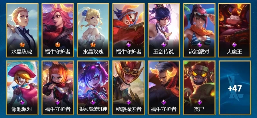 阿卡麗-K/DA ALL OUT,布里茨-擂臺皇帝,賈克斯-光明騎士,阿狸-K/DA ALL OUT,凱南-超級英雄,奧瑞利安·索爾-灰燼領主,崔斯特-王牌艦長,嘉文四世-福牛守護者,娑娜-水晶玫瑰,雷克頓-枯萎之壤,娜美-原始碼,奧拉夫-黑暗騎士,厄運小姐-福牛守護者,安妮-福牛守護者,艾瑞莉婭-光明哨兵,希瓦娜-秘旅探索者,庫奇-柯基,伊澤瑞爾-冰川勇者,菲奧娜-緋金麗刃,金克絲-雙城之戰,菲奧娜-福牛守護者,伊澤瑞爾-水晶玫瑰,提莫-大魔王,阿利斯塔-福牛守護者,安妮-銀河魔裝機神,嘉文四世-水晶玫瑰,厄運小姐-西部牛仔,卡茲克-暗星,銳雯-電玩勇者,努努和威朗普-喪屍,菲奧娜-皇家守衛,吉格斯-兔寶寶,亞索-西部牛仔,艾希-王牌司令,蔚-雙城之戰,亞索-源計劃:風,卡特琳娜-戰鬥學院,艾瑞莉婭-冰霜之刃,菲茲-兔寶寶,雷克頓-鱷霸,菲奧娜-泳池派對,璐璐-光耀之靈,拉克絲-水晶玫瑰,庫奇-海牛騎手,德萊厄斯-福牛守護者,格雷福斯-戰鬥教授,阿卡麗-銀色之牙,提莫-熊貓,阿狸-焰尾妖狐,布隆-聖誕老人,德萊文-緋金戰斧,菲奧娜-玉劍傳說 無雙,韋魯斯-蒼穹之光,艾瑞莉婭-玉劍傳說 舞劍仙,蔚-女警官,崔絲塔娜-娜就去看看,雷克頓-泳池派對,嘉文四世-王牌上將,吉格斯-奧術大師,奧莉安娜-泳池派對