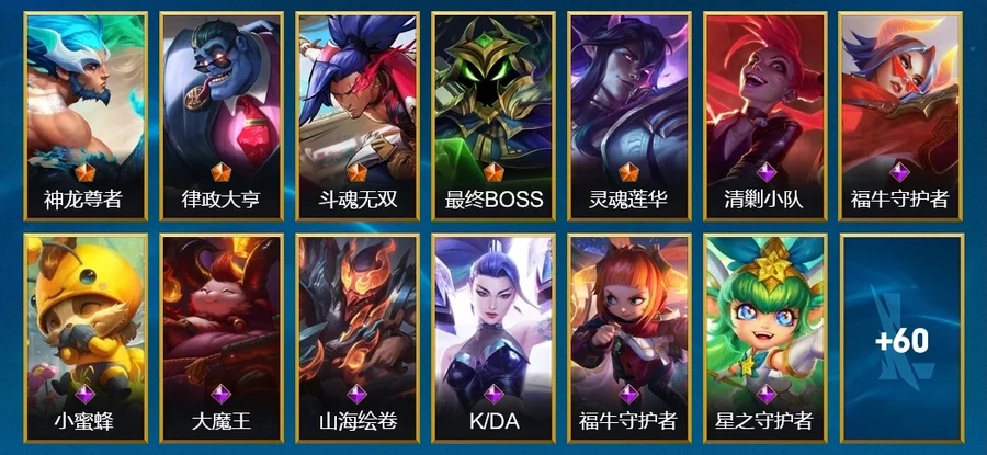 古拉加斯-碎桶者,錘石-西部魔影,布里茨-擂臺皇帝,薩勒芬妮-星之守護者,尼菈-鬥魂無雙,奧拉夫-鐵哥們兒,崔斯特-王牌艦長,嘉文四世-孤膽英豪,嘉文四世-福牛守護者,賈克斯-武神,雷克頓-枯萎之壤,奧拉夫-黑暗騎士,德萊文-破敗軍團,易-神龍尊者 馭風嘯龍,蒙多醫生-戰爭血統 蒙多,蒙多醫生-律政大亨 蒙多,安妮-福牛守護者,內瑟斯-單身貴族,諾提勒斯-山海繪卷,奧莉安娜-光耀之心,燼-山海繪卷,菲奧娜-緋金麗刃,阿狸-幻夢甜心,菲奧娜-福牛守護者,卡蜜爾-星域審判官,提莫-大魔王,阿利斯塔-福牛守護者,霞-暮星之羽,韋魯斯-迅箭,格溫-太空律動 “百萬調音”,阿利斯塔-黑暗騎士,阿卡麗-源計劃:暗影,厄運小姐-西部牛仔,菲奧娜-皇家守衛,吉格斯-兔寶寶,凱南-超武乾坤:電弧,亞索-西部牛仔,蕾歐娜-燒烤女神,凱特琳-鐵血狙擊手,奧拉夫-獵龍勇士,亞索-鬥魂無雙,蔚-雙城之戰,格雷福斯-黑暗騎士,艾瑞莉婭-冰霜之刃,內瑟斯-太空律動 “狗頭”,雷克頓-鱷霸,潘森-清剿小隊,璐璐-光耀之靈,德萊厄斯-福牛守護者,阿狸-偶像歌手,提莫-熊貓,德萊文-緋金戰斧,璐璐-星之守護者,加里奧-神龍守衛,韋魯斯-蒼穹之光,錘石-未來戰士,提莫-小蜜蜂,亞託克斯-腥紅之月,蔚-女警官,艾瑞莉婭-鬥魂無雙,娑娜-繆斯女神,錘石-靈魂蓮華,泰達米爾-光耀之刃,卡莎-K/DA ALL OUT,提莫-兔寶寶,亞託克斯-山海繪卷,德萊文-鬥魂無雙,布隆-獅心,金克絲-清剿小隊,艾瑞莉婭-蓮花之令,維迦-最終BOSS,德萊文-德萊德萊,璐璐-邪惡女巫
