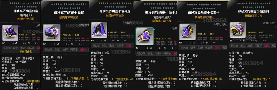 傳說防具 (帽子、肩膊、 披風 、鞋子、手套) 單件:﹩720 整套: 2500