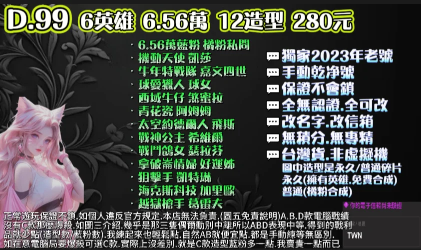 | 30等.6萬粉.10~13造型.5~10英雄.可挑造型.此賣場有圖可看 |