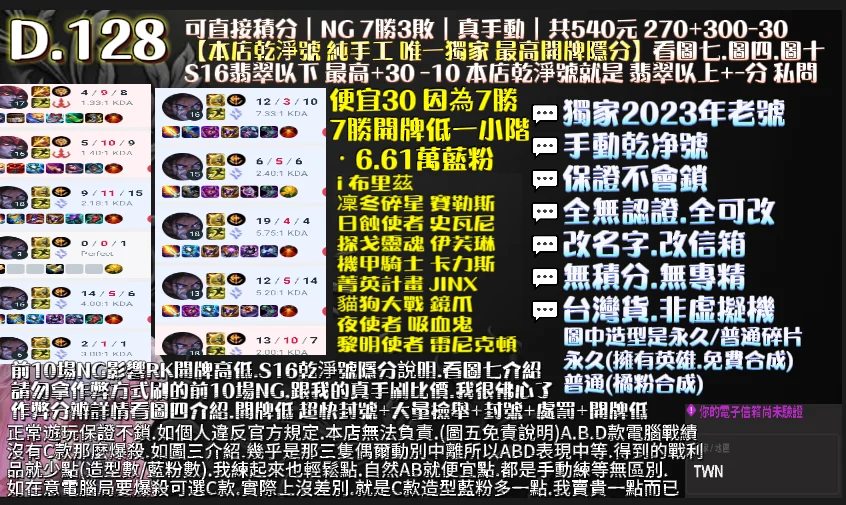 ⛔購買可直接積分商品,一定要求店家給你查詢前10場NG的戰績,直接對比本店10場戰績 就知道是不是真手刷 不會分辨就問我