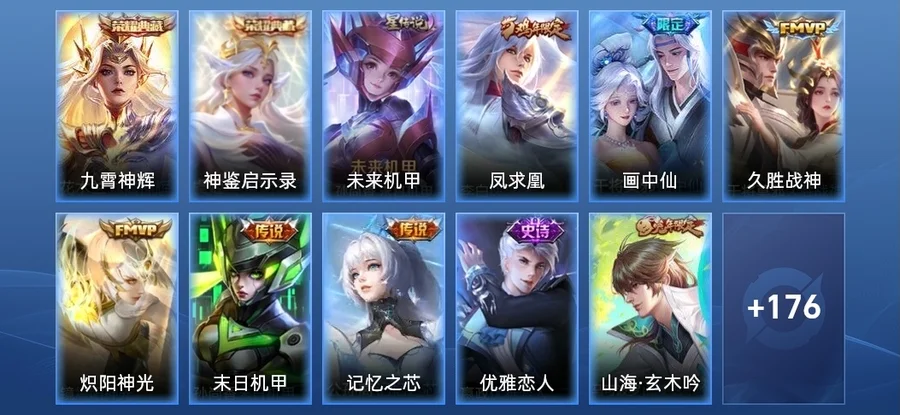 鬼谷子-五穀豐年,嬴政-優雅戀人,裴擒虎-李小龍,蒙恬-榮光聖徽,明世隱-吟遊魔法,夢奇-頑趣,鍾無豔-超時空戰士,阿古朵-江河有靈,米萊狄-胡桃異想國,馬可波羅-山海·玄木吟,干將莫邪-冰霜戀舞曲,蘭陵王-馴魔獵人,上官婉兒-梁祝,元歌-無心,趙雲-皇家上將,狄仁傑-魔術師,百里玄策-原初追逐者,孫悟空-孫行者,嬴政-白晝王子,黃忠-火炮紳士,老夫子-航海奇遇記,雅典娜-黎明之約,雲中君-纖雲弄巧