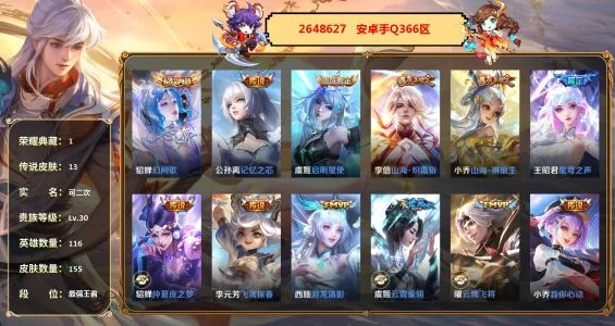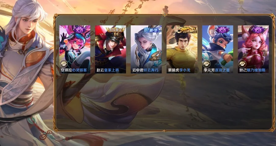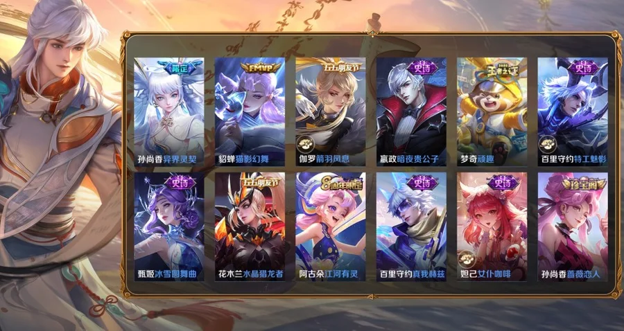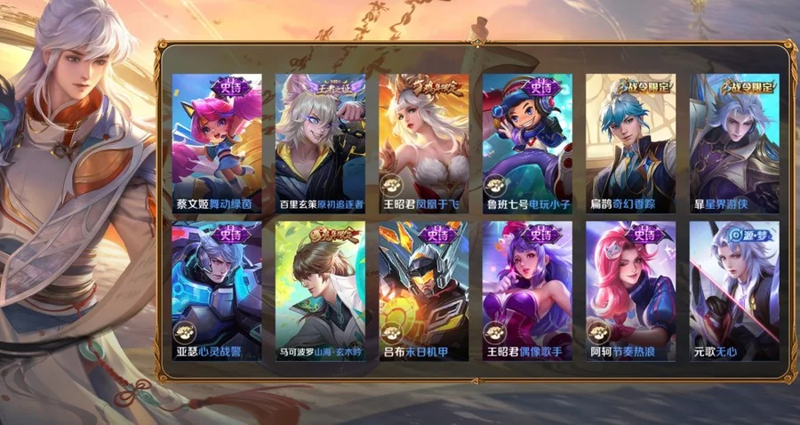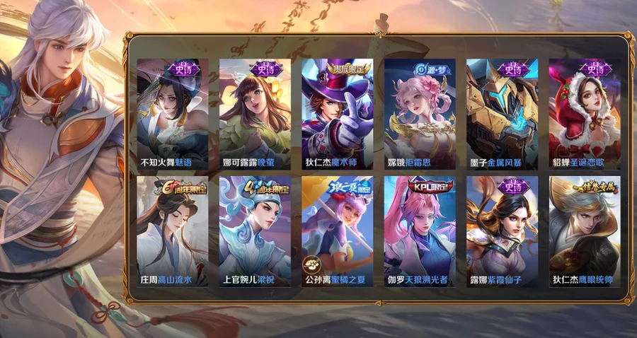 桑啟-畫中遊,百里守約-絕影神槍,曹操-超能戰警,嫦娥-露花倒影,大喬-伊勢巫女,狄仁傑-錦衣衛,貂蟬-異域舞娘,東皇太一-東海龍王,伽羅-花見巫女,干將莫邪-第七人偶,公孫離-花間舞,鬼谷子-阿摩司公爵,后羿-精靈王,鏡-冰刃幻境,瀾-孤獵,露娜-緋紅之刃,夢奇-美夢成真,明世隱-占星師,裴擒虎-街頭旋風,上官婉兒-修竹墨客,司空震-啟蟄,蘇烈-愛與和平,孫臏-未來旅行,太乙真人-圓桌騎士,王昭君-精靈公主,西施-歸虛夢演,楊玉環-霓裳曲,瑤-森,曜-歸虛夢演,弈星-踏雪尋梅,雲纓-赤焰之纓,張良-一千零一夜
