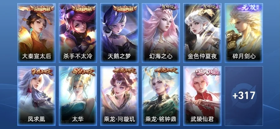 李元芳-特種部隊,花木蘭-劍舞者,豬八戒-潮玩探月行,明世隱-虹雲星官,張良-幽蘭居士,沈夢溪-棒球奇才,哪吒-三太子,妲己-紫羅蘭之誓,關羽-天啟騎士,李信-灼熱之刃,楊玉環-霓裳曲,大喬-守護之力,裴擒虎-街頭旋風,海月-幻泉霧影,牛魔-西部大鏢客,豬八戒-年年有餘,孫尚香-火炮千金,姜子牙-熾熱元素使,鍾無豔-生化警戒,老夫子-潮流仙人,程咬金-星際陸戰隊,曹操-幽靈船長,亞瑟-死亡騎士,老夫子-功夫老勺,亞瑟-心靈戰警,孫悟空-西部大鏢客,雲中君-荷魯斯之眼,百里守約-特工魅影,趙雲-未來紀元,諸葛亮-星航指揮官,甄姬-冰雪圓舞曲,韓信-街頭霸王,阿軻-致命風華,白起-星夜王子,墨子-龍騎士,孫臏-歸虛夢演,典韋-黃金武士,武則天-東方不敗,孫尚香-水果甜心,曹操-死神來了,甄姬-花好人間,劉邦-聖殿之光,花木蘭-兔女郎,魯班七號-黑桃隊長,米萊狄-精準探案法,劉備-漢昭烈帝,雅典娜-冰冠公主,劉禪-秘密基地,黃忠-芝加哥教父,弈星-踏雪尋梅,李元芳-逐浪之夏,扁鵲-化身博士,蘇烈-愛與和平,牛魔-制霸全明星,阿古朵-熊喵少女,雲纓-赤焰之纓,王昭君-精靈公主,妲己-少女阿狸,白起-白色死神,公孫離-花間舞,魯班大師-歸虛夢演,嫦娥-露花倒影,小喬-繽紛獨角獸,馬超-倖存者,宮本武藏-霸王丸,宮本武藏-未來紀元,達摩-大發明家,盾山-極冰防禦線,程咬金-無雙福將,上官婉兒-修竹墨客,張飛-五福同心,盤古-創世神祝,小喬-青蛇,安琪拉-心靈駭客,虞姬-加勒比小姐,關羽-龍騰萬里,露娜-哥特玫瑰,魯班七號-電玩小子,夏洛特-永晝,蔡文姬-薔薇王座,馬可波羅-激情綠茵,李白-敏銳之力,張良-繽紛繪卷,雅典娜-戰爭女神,張良-古海尋蹤,達摩-拳王,莊周-鯉魚之夢,夏侯惇-乘風破浪,程咬金-愛與正義,妲己-仙境愛麗絲,羋月-紅桃皇后,瑤-森,夏侯惇-戰爭騎士,典韋-鐵甲之心,伽羅-箭羽風息,大喬-伊勢巫女,安琪拉-玩偶對對碰,小喬-丁香結,鎧-龍域領主,孫尚香-時之戀人,蘭陵王-隱刃,張飛-亂世虎臣,女媧-尼羅河女神,劉邦-德古拉伯爵,夢奇-美夢成真,高漸離-金屬狂潮,呂布-野性能量,狄仁傑-錦衣衛,鏡-冰刃幻境,曹操-超能戰警,蔡文姬-舞動綠茵,宮本武藏-永珍初新,安琪拉-如懿,張良-天堂福音,墨子-金屬風暴,瀾-孤獵,程咬金-功夫廚神,娜可露露-晚螢,鬼谷子-阿摩司公爵,魯班大師-乓乓大師,露娜-緋紅之刃,扁鵲-救世之瞳,孫策-海之征途,花木蘭-水晶獵龍者,曜-歸虛夢演,阿軻-愛心護理,伽羅-花見巫女,劉禪-紳士熊喵,蘭陵王-暗隱獵獸者,百里守約-絕影神槍,李元芳-黑貓愛糖果,不知火舞-魅語,狄仁傑-鷹眼統帥,沈夢溪-鯊炮海盜貓,周瑜-海軍大將,諸葛亮-掌控之力,姜子牙-時尚教父,劉禪-英喵野望,嬴政-搖滾巨星,司馬懿-暗淵魔法,李白-範海辛,明世隱-占星師,蘇烈-堅韌之力,露娜-瓷語鑑心,小喬-萬聖前夜,魯班七號-福祿兄弟,趙雲-忍·炎影,百里玄策-威尼斯狂歡,西施-歸虛夢演,劉禪-喚靈魔甲,司馬懿-魘語軍師,后羿-精靈王,桑啟-畫中遊,貂蟬-聖誕戀歌,阿軻-暗夜貓娘,廉頗-地獄巖魂,露娜-紫霞仙子,孫臏-未來旅行,白起-樂園追獵者,項羽-科學大爆炸,金蟬-前塵,墨子-進擊墨子號,司空震-啟蟄,大喬-貓狗日記,鬼谷子-幻樂之宴,蒙犽-歸虛夢演,橘右京-修羅,魯班七號-木偶奇遇記,牛魔-牛運亨通,劉禪-天才門將,李白-千年之狐,韓信-教廷特使,蒙恬-秩序獵龍將,莊周-奇妙博物學,狂鐵-命運角鬥場,劉備-紐約教父,張良-一千零一夜,劉備-萬事如意,孫臏-天使之翼,干將莫邪-第七人偶,王昭君-偶像歌手,貂蟬-異域舞娘,哪吒-次元突破,暃-碧珀緋影,妲己-魅力維加斯,元歌-午夜歌劇院,楊戩-埃及法老,孫尚香-沉穩之力,鍾馗-地府判官,宮本武藏-鬼劍武藏,趙雲-嘻哈天王,成吉思汗-維京掠奪者,鍾無豔-海灘麗影,項羽-帝國元帥,后羿-阿爾法小隊,狂鐵-特工戰影,米萊狄-契約魔法,呂布-聖誕狂歡,妲己-女僕咖啡,東皇太一-東海龍王,太乙真人-圓桌騎士