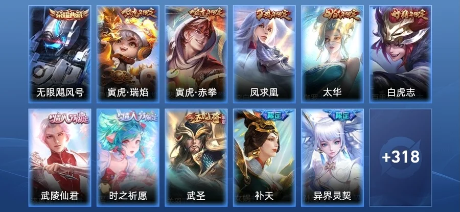 女媧-補天,虞姬-啟明星使,關羽-武聖,曜-李逍遙,裴擒虎-寅虎·赤拳,諸葛亮-武陵仙君,百里玄策-白虎志,李白-鳳求凰,孫尚香-異界靈契,伽羅-太華,魯班七號-寅虎·瑞焰,瑤-時之祈願