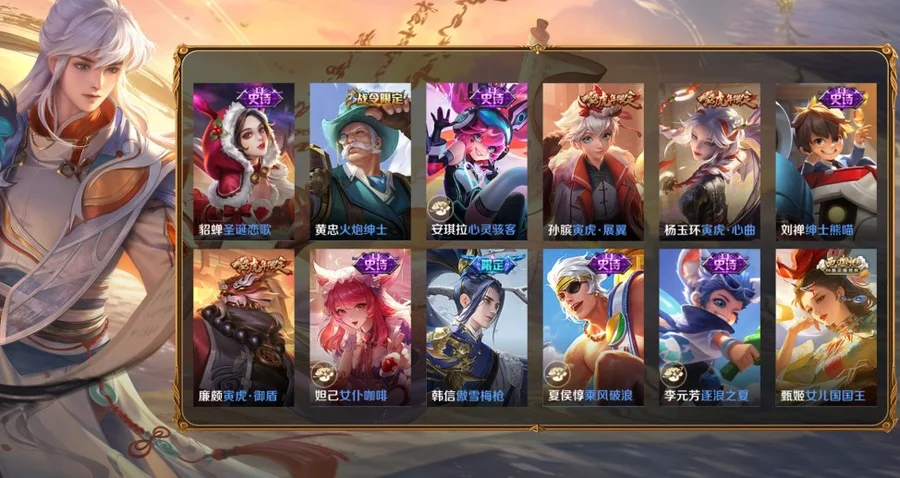羋月-紅桃皇后,亞連-破局者,鍾無豔-聚星閃耀,海月-王牌新星,張良-古海尋蹤,艾琳-流音漫舞,明世隱-疑決卦,李元芳-妄想特派,劉備-潮玩造夢師,安琪拉-玩偶對對碰,姜子牙-熾熱元素使,墨子-進擊墨子號,孫臏-歸虛夢演,項羽-海灘派對,亞瑟-死亡騎士,魯班大師-探海日誌,楊戩-潮玩騎兵,裴擒虎-擒濤扼浪,沈夢溪-大漠名商,米萊狄-契約魔法,劉禪-喚靈魔甲,白起-夜都怪俠,白起-白色死神,扁鵲-化身博士,程咬金-愛與正義,程咬金-無雙福將,達摩-大發明家,達摩-拳王,達摩-沙漠行僧,妲己-少女阿狸,大喬-守護之力,狄仁傑-陰陽師,狄仁傑-萬華元夜,典韋-黃金武士,典韋-鐵甲之心,典韋-窮奇,盾山-御鑾,盾山-圓桌騎士,高漸離-玩趣惡龍,宮本武藏-霸王丸,鬼谷子-幻樂之宴,鬼谷子-原初探秘者,韓信-教廷特使,后羿-阿爾法小隊,花木蘭-兔女郎,狂鐵-御獅,狂鐵-特工戰影,老夫子-功夫老勺,老夫子-醍醐杖,李白-敏銳之力,廉頗-無盡征程,劉邦-虎嘯劍宗,劉備-萬事如意,劉備-紐約教父,劉備-漢昭烈帝,劉禪-秘密基地,露娜-哥特玫瑰,露娜-瓷語鑑心,魯班大師-乓乓大師,魯班七號-黑桃隊長,呂布-野性能量,米萊狄-御霄,羋月-幻夜卜夢,明世隱-虹雲星官,哪吒-次元突破,牛魔-西部大鏢客,牛魔-御旌,沈夢溪-鯊炮海盜貓,蘇烈-堅韌之力,蘇烈-千軍破陣,孫尚香-沉穩之力,項羽-科學大爆炸,雅典娜-單詞大作戰,楊戩-次元傲視,弈星-混沌棋,甄姬-花好人間,鍾馗-驅儺正儀,鍾無豔-海灘麗影,諸葛亮-掌控之力,莊周-奇妙博物學,太乙真人-勁辣紅鍋,姜子牙-時尚教父