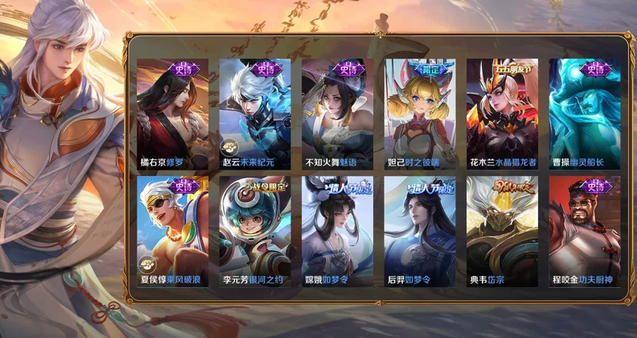 阿古朵-熊喵少女,百里守約-絕影神槍,百里玄策-威尼斯狂歡,曹操-死神來了,嫦娥-露花倒影,成吉思汗-維京掠奪者,大喬-伊勢巫女,狄仁傑-錦衣衛,貂蟬-異域舞娘,東皇太一-東海龍王,干將莫邪-第七人偶,高漸離-金屬狂潮,公孫離-花間舞,關羽-天啟騎士,花木蘭-劍舞者,黃忠-芝加哥教父,鏡-冰刃幻境,鎧-龍域領主,蘭陵王-隱刃,老夫子-潮流仙人,李白-範海辛,李元芳-特種部隊,劉邦-聖殿之光,魯班七號-木偶奇遇記,魯班七號-福祿兄弟,馬超-倖存者,馬可波羅-激情綠茵,蒙恬-秩序獵龍將,蒙犽-歸虛夢演,明世隱-占星師,上官婉兒-修竹墨客,沈夢溪-棒球奇才,司馬懿-魘語軍師,蘇烈-愛與和平,孫悟空-西部大鏢客,王昭君-精靈公主,夏侯惇-戰爭騎士,項羽-帝國元帥,楊戩-埃及法老,曜-歸虛夢演,虞姬-加勒比小姐,元歌-午夜歌劇院,雲中君-荷魯斯之眼