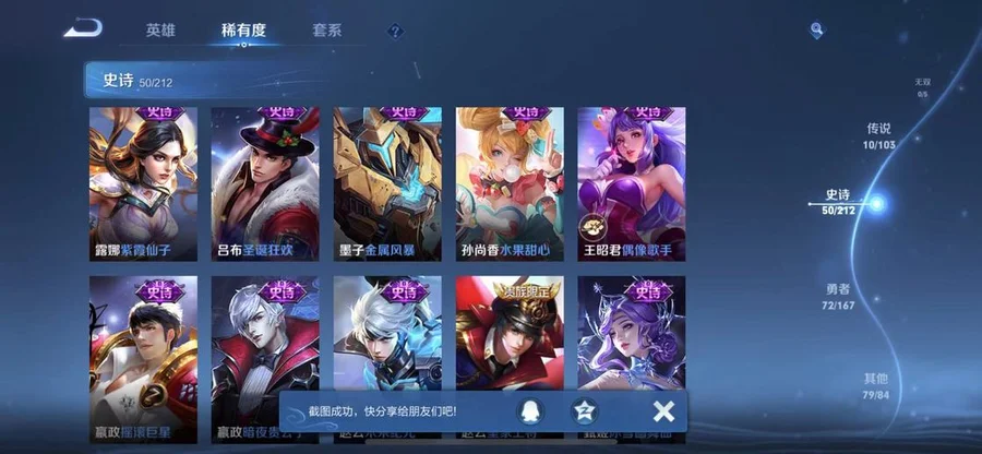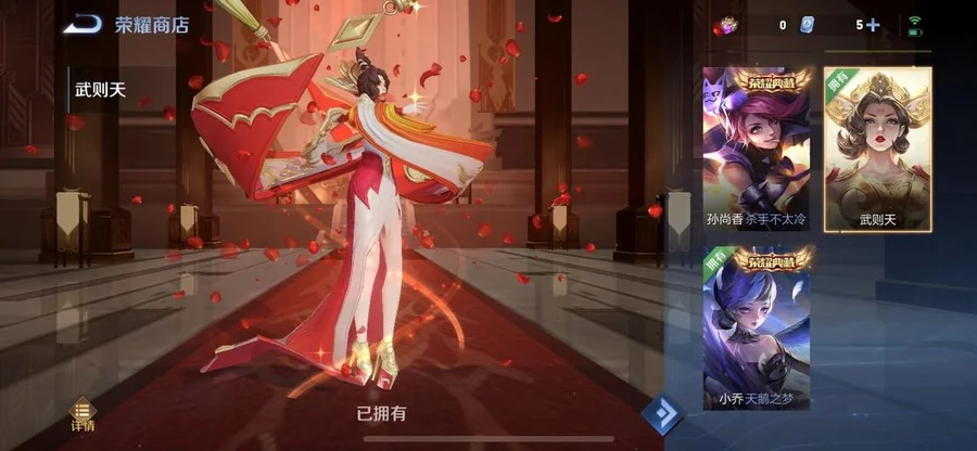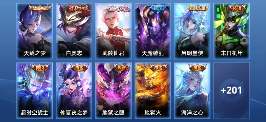 蘭陵王-隱刃,張飛-亂世虎臣,花木蘭-劍舞者,李元芳-特種部隊,女媧-尼羅河女神,明世隱-虹雲星官,王昭君-幻想奇妙夜,劉邦-德古拉伯爵,夢奇-美夢成真,張良-幽蘭居士,沈夢溪-棒球奇才,哪吒-三太子,關羽-天啟騎士,李信-灼熱之刃,楊玉環-霓裳曲,大喬-守護之力,裴擒虎-街頭旋風,牛魔-西部大鏢客,高漸離-金屬狂潮,豬八戒-年年有餘,孫尚香-火炮千金,姜子牙-熾熱元素使,狄仁傑-錦衣衛,鍾無豔-生化警戒,鏡-冰刃幻境,老夫子-潮流仙人,曹操-超能戰警,程咬金-星際陸戰隊,曹操-幽靈船長,亞瑟-死亡騎士,老夫子-功夫老勺,宮本武藏-永珍初新,孫悟空-西部大鏢客,安琪拉-如懿,雲中君-荷魯斯之眼,張良-天堂福音,墨子-金屬風暴,瀾-孤獵,百里守約-特工魅影,趙雲-未來紀元,諸葛亮-星航指揮官,娜可露露-晚螢,鬼谷子-阿摩司公爵,甄姬-冰雪圓舞曲,露娜-緋紅之刃,扁鵲-救世之瞳,韓信-街頭霸王,阿軻-致命風華,趙雲-白執事,孫策-海之征途,韓信-白龍吟,花木蘭-水晶獵龍者,曜-歸虛夢演,伽羅-花見巫女,阿軻-愛心護理,百里守約-絕影神槍,蘭陵王-暗隱獵獸者,典韋-黃金武士,武則天-東方不敗,不知火舞-魅語,孫尚香-水果甜心,曹操-死神來了,甄姬-花好人間,狄仁傑-鷹眼統帥,劉邦-聖殿之光,沈夢溪-鯊炮海盜貓,花木蘭-兔女郎,米萊狄-精準探案法,劉備-漢昭烈帝,周瑜-海軍大將,姜子牙-時尚教父,諸葛亮-黃金分割率,劉禪-英喵野望,嬴政-搖滾巨星,弈星-踏雪尋梅,程咬金-華爾街大亨,明世隱-占星師,黃忠-芝加哥教父,李白-範海辛,蘇烈-堅韌之力,小喬-萬聖前夜,扁鵲-化身博士,蘇烈-愛與和平,牛魔-制霸全明星,魯班七號-福祿兄弟,趙雲-忍·炎影,百里玄策-威尼斯狂歡,阿古朵-熊喵少女,西施-歸虛夢演,王昭君-精靈公主,妲己-少女阿狸,劉禪-喚靈魔甲,司馬懿-魘語軍師,白起-白色死神,后羿-精靈王,公孫離-花間舞,魯班大師-歸虛夢演,貂蟬-聖誕戀歌,嫦娥-露花倒影,小喬-繽紛獨角獸,馬超-倖存者,宮本武藏-霸王丸,宮本武藏-未來紀元,露娜-紫霞仙子,孫臏-未來旅行,盾山-極冰防禦線,達摩-大發明家,上官婉兒-修竹墨客,項羽-科學大爆炸,張飛-五福同心,墨子-進擊墨子號,大喬-貓狗日記,盤古-創世神祝,鬼谷子-幻樂之宴,蒙犽-歸虛夢演,安琪拉-心靈駭客,橘右京-修羅,虞姬-加勒比小姐,魯班七號-木偶奇遇記,關羽-龍騰萬里,韓信-教廷特使,李白-千年之狐,蒙恬-秩序獵龍將,莊周-奇妙博物學,狂鐵-命運角鬥場,露娜-哥特玫瑰,張良-一千零一夜,劉備-萬事如意,孫臏-天使之翼,干將莫邪-第七人偶,王昭君-偶像歌手,貂蟬-異域舞娘,蔡文姬-薔薇王座,哪吒-次元突破,馬可波羅-激情綠茵,妲己-魅力維加斯,雅典娜-戰爭女神,元歌-午夜歌劇院,達摩-拳王,楊戩-埃及法老,莊周-鯉魚之夢,夏侯惇-乘風破浪,鍾馗-地府判官,程咬金-愛與正義,嬴政-暗夜貴公子,妲己-仙境愛麗絲,羋月-紅桃皇后,瑤-森,成吉思汗-維京掠奪者,夏侯惇-戰爭騎士,鍾無豔-海灘麗影,項羽-帝國元帥,后羿-阿爾法小隊,安琪拉-玩偶對對碰,大喬-伊勢巫女,呂布-聖誕狂歡,鎧-龍域領主,妲己-女僕咖啡,東皇太一-東海龍王,太乙真人-圓桌騎士