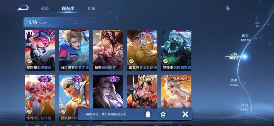 魯班七號,阿軻,盤古,米萊狄,大喬,東皇太一,韓信,豬八戒,亞瑟,西施,李元芳,女媧,孫策,貂蟬,弈星,夏侯惇,程咬金,扁鵲,蔡文姬,狄仁傑,小喬,狂鐵,露娜,楊玉環,盾山,明世隱,張良,司馬懿,成吉思汗,鍾無豔,花木蘭,安琪拉,孫臏,蒙犽,夏洛特,牛魔,鏡,虞姬,李信,蘭陵王,哪吒,元歌,典韋,艾琳,甄姬,劉禪,雅典娜,干將莫邪,夢奇,鬼谷子,阿古朵,莊周,妲己,瑤,項羽,達摩,后羿,嬴政,馬可波羅,暃,呂布,劉邦,馬超,武則天,黃忠,司空震,羋月,白起,太乙真人,娜可露露,瀾,關羽,墨子,百里守約,老夫子,趙雲,魯班大師,伽羅,張飛,諸葛亮,孫悟空,上官婉兒,姜子牙,孫尚香,雲纓,裴擒虎,不知火舞,楊戩,蘇烈,鍾馗,高漸離,廉頗,公孫離,曜,鎧,李白,蒙恬,劉備,王昭君,橘右京,沈夢溪,百里玄策,雲中君,桑啟,嫦娥,宮本武藏,曹操,周瑜
