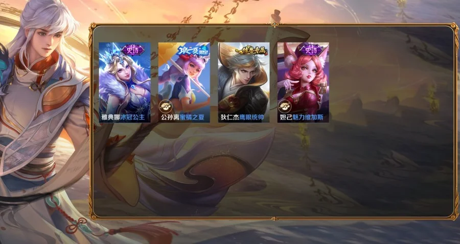 盾山-極冰防禦線,鬼谷子-阿摩司公爵,后羿-精靈王,馬可波羅-激情綠茵,女媧-尼羅河女神,上官婉兒-修竹墨客,孫臏-未來旅行,王昭君-精靈公主,楊玉環-霓裳曲