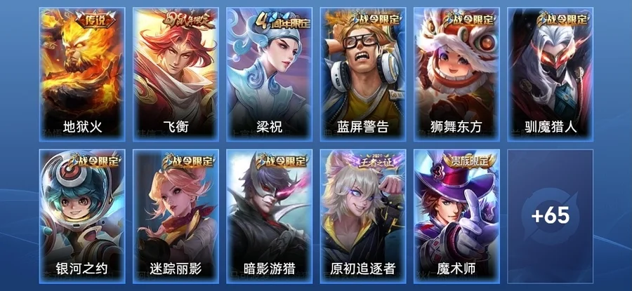 魯班大師-乓乓大師,蘭陵王-隱刃,公孫離-花間舞,趙雲-白執事,馬可波羅-激情綠茵,鎧-曙光守護者,墨子-龍騎士,妲己-魅力維加斯,王昭君-幻想奇妙夜,阿軻-愛心護理,雅典娜-戰爭女神,宮本武藏-霸王丸,蘭陵王-暗隱獵獸者,百里守約-絕影神槍,元歌-午夜歌劇院,典韋-黃金武士,李信-灼熱之刃,夏侯惇-乘風破浪,上官婉兒-修竹墨客,狄仁傑-鷹眼統帥,張飛-五福同心,豬八戒-年年有餘,呂布-野性能量,宮本武藏-鬼劍武藏,花木蘭-兔女郎,魯班七號-黑桃隊長,瑤-森,夏侯惇-戰爭騎士,雅典娜-冰冠公主,后羿-阿爾法小隊,亞瑟-死亡騎士,宮本武藏-永珍初新,孫悟空-西部大鏢客,韓信-教廷特使,李白-千年之狐,關羽-龍騰萬里,呂布-聖誕狂歡,露娜-哥特玫瑰,百里守約-特工魅影,干將莫邪-第七人偶,諸葛亮-星航指揮官,東皇太一-東海龍王,妲己-少女阿狸