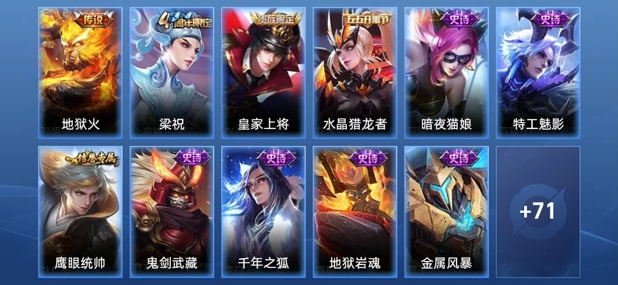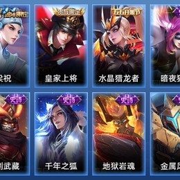 公孫離-花間舞,花木蘭-劍舞者,明世隱-虹雲星官,沈夢溪-棒球奇才,阿軻-暗夜貓娘,宮本武藏-霸王丸,廉頗-地獄巖魂,項羽-科學大爆炸,呂布-野性能量,張飛-五福同心,老夫子-功夫老勺,宮本武藏-永珍初新,孫悟空-西部大鏢客,李白-千年之狐,韓信-教廷特使,關羽-龍騰萬里,墨子-金屬風暴,劉備-紐約教父,百里守約-特工魅影,楊戩-次元傲視,趙雲-未來紀元,諸葛亮-星航指揮官,貂蟬-異域舞娘,露娜-緋紅之刃,韓信-街頭霸王,阿軻-致命風華,哪吒-次元突破,馬可波羅-激情綠茵,孫策-海之征途,花木蘭-水晶獵龍者,阿軻-愛心護理,達摩-拳王,盾山-圓桌騎士,夏侯惇-乘風破浪,甄姬-花好人間,狄仁傑-鷹眼統帥,程咬金-愛與正義,宮本武藏-鬼劍武藏,花木蘭-兔女郎,沈夢溪-鯊炮海盜貓,鍾無豔-海灘麗影,諸葛亮-掌控之力,劉禪-秘密基地,李白-範海辛,蘇烈-堅韌之力,大喬-伊勢巫女,安琪拉-玩偶對對碰,露娜-瓷語鑑心,扁鵲-化身博士,趙雲-忍·炎影,雲纓-赤焰之纓,妲己-少女阿狸