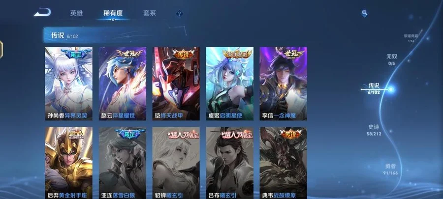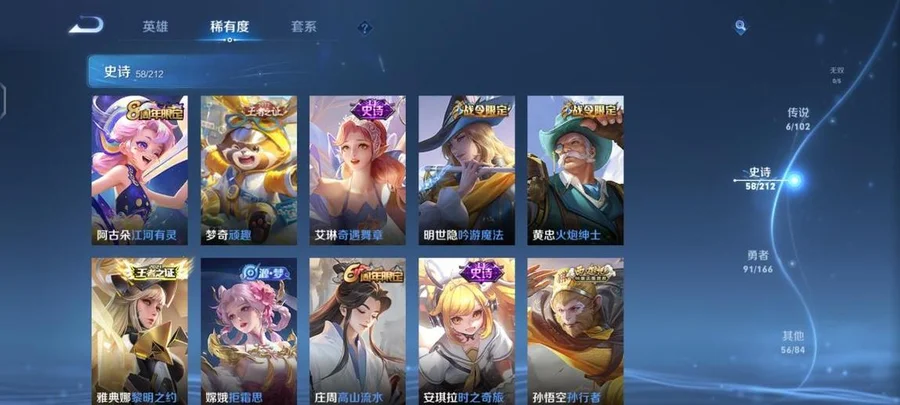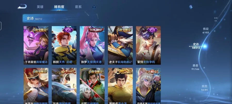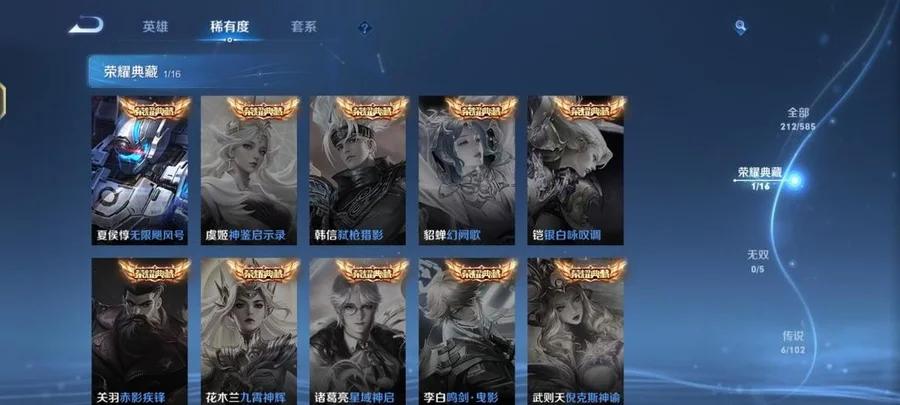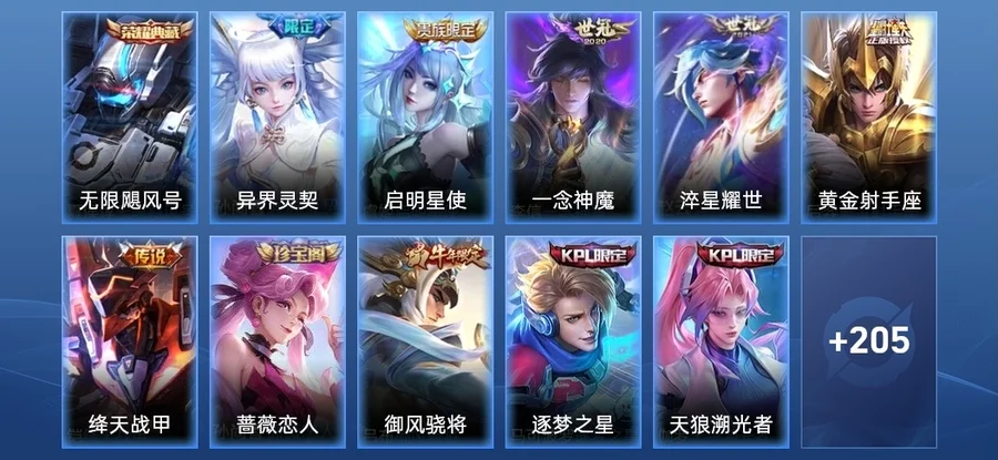 張飛-亂世虎臣,李元芳-特種部隊,豬八戒-潮玩探月行,明世隱-虹雲星官,夢奇-美夢成真,王昭君-幻想奇妙夜,劉邦-德古拉伯爵,沈夢溪-棒球奇才,哪吒-三太子,妲己-紫羅蘭之誓,關羽-天啟騎士,李信-灼熱之刃,楊玉環-霓裳曲,裴擒虎-街頭旋風,大喬-守護之力,高漸離-金屬狂潮,豬八戒-年年有餘,呂布-野性能量,姜子牙-熾熱元素使,狄仁傑-錦衣衛,鏡-冰刃幻境,老夫子-潮流仙人,李元芳-妄想特派,曹操-幽靈船長,亞瑟-死亡騎士,老夫子-功夫老勺,亞瑟-心靈戰警,宮本武藏-永珍初新,楊戩-天秀·啟明,雲中君-荷魯斯之眼,墨子-金屬風暴,瀾-孤獵,程咬金-功夫廚神,亞連-破局者,蒙犽-龍鼓爭鳴,娜可露露-晚螢,甄姬-冰雪圓舞曲,魯班大師-乓乓大師,韓信-街頭霸王,趙雲-白執事,花木蘭-水晶獵龍者,孫策-海之征途,曜-歸虛夢演,孫臏-歸虛夢演,阿軻-愛心護理,伽羅-花見巫女,劉禪-紳士熊喵,百里守約-絕影神槍,蘭陵王-暗隱獵獸者,盾山-圓桌騎士,孫尚香-水果甜心,曹操-死神來了,呂布-末日機甲,甄姬-花好人間,狄仁傑-鷹眼統帥,花木蘭-兔女郎,劉備-漢昭烈帝,周瑜-海軍大將,諸葛亮-掌控之力,姜子牙-時尚教父,劉禪-英喵野望,嬴政-搖滾巨星,艾琳-奇遇舞章,李白-範海辛,弈星-踏雪尋梅,黃忠-芝加哥教父,蘇烈-堅韌之力,李元芳-逐浪之夏,露娜-瓷語鑑心,扁鵲-化身博士,蘇烈-愛與和平,牛魔-制霸全明星,魯班七號-福祿兄弟,百里玄策-威尼斯狂歡,雲纓-赤焰之纓,王昭君-精靈公主,妲己-少女阿狸,劉禪-喚靈魔甲,司馬懿-魘語軍師,白起-白色死神,太乙真人-勁辣紅鍋,后羿-精靈王,公孫離-花間舞,桑啟-畫中遊,貂蟬-聖誕戀歌,嫦娥-露花倒影,小喬-繽紛獨角獸,宮本武藏-霸王丸,廉頗-地獄巖魂,孫臏-未來旅行,程咬金-無雙福將,金蟬-前塵,張飛-五福同心,司空震-啟蟄,盤古-創世神祝,鬼谷子-幻樂之宴,孫策-貓狗日記,蒙犽-歸虛夢演,橘右京-修羅,虞姬-加勒比小姐,劉禪-天才門將,韓信-教廷特使,李白-千年之狐,關羽-龍騰萬里,莊周-奇妙博物學,蒙恬-秩序獵龍將,項羽-蒼穹之光,劉備-紐約教父,安琪拉-時之奇旅,劉備-萬事如意,孫臏-天使之翼,王昭君-偶像歌手,貂蟬-異域舞娘,蔡文姬-薔薇王座,哪吒-次元突破,馬可波羅-激情綠茵,暃-碧珀緋影,李白-敏銳之力,妲己-魅力維加斯,盤古-重灌意志,雅典娜-戰爭女神,張良-繽紛繪卷,元歌-午夜歌劇院,張良-古海尋蹤,鍾無豔-聚星閃耀,楊戩-埃及法老,莊周-鯉魚之夢,孫尚香-沉穩之力,夏侯惇-乘風破浪,宮本武藏-鬼劍武藏,羋月-紅桃皇后,夏侯惇-戰爭騎士,成吉思汗-維京掠奪者,鍾無豔-海灘麗影,項羽-帝國元帥,后羿-阿爾法小隊,狂鐵-特工戰影,典韋-鐵甲之心,伽羅-箭羽風息,大喬-伊勢巫女,鎧-龍域領主,呂布-聖誕狂歡,妲己-女僕咖啡,太乙真人-圓桌騎士,東皇太一-東海龍王