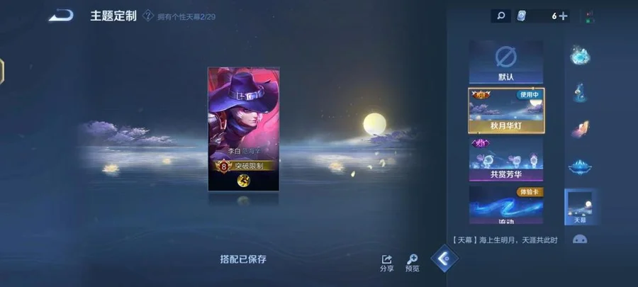典韋-藍色畫面警告,裴擒虎-李小龍,明世隱-吟遊魔法,元歌-雲間偶戲,夢奇-頑趣,孫尚香-薔薇戀人,嫦娥-拒霜思,阿古朵-江河有靈,伽羅-天狼溯光者,米萊狄-胡桃異想國,呂布-御風驍將,狄仁傑-魔術師,趙雲-皇家上將,上官婉兒-梁祝,孫悟空-孫行者,百里玄策-原初追逐者,黃忠-火炮紳士,虞姬-霸王別姬,老夫子-航海奇遇記,干將莫邪-真愛魔法,雅典娜-黎明之約,莊周-高山流水,馬可波羅-逐夢之星
