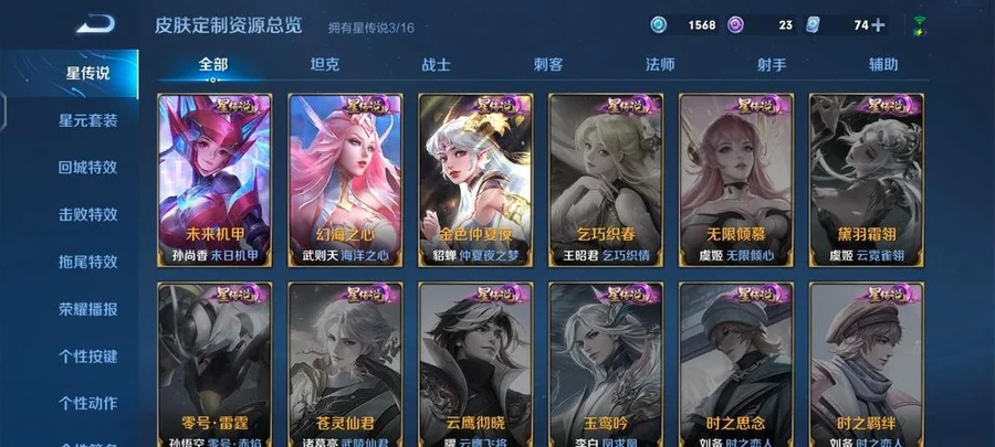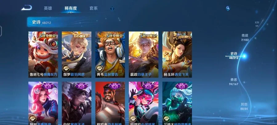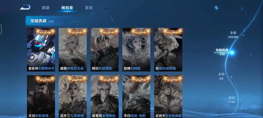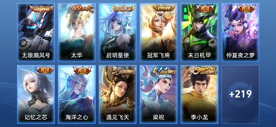 蘭陵王-隱刃,花木蘭-劍舞者,李元芳-特種部隊,女媧-尼羅河女神,豬八戒-潮玩探月行,明世隱-虹雲星官,王昭君-幻想奇妙夜,夢奇-美夢成真,沈夢溪-棒球奇才,哪吒-三太子,妲己-紫羅蘭之誓,關羽-天啟騎士,李信-灼熱之刃,楊玉環-霓裳曲,大喬-守護之力,裴擒虎-街頭旋風,高漸離-金屬狂潮,豬八戒-年年有餘,呂布-野性能量,姜子牙-熾熱元素使,狄仁傑-錦衣衛,鍾無豔-生化警戒,鏡-冰刃幻境,老夫子-潮流仙人,曹操-超能戰警,程咬金-星際陸戰隊,亞瑟-死亡騎士,老夫子-功夫老勺,宮本武藏-永珍初新,孫悟空-西部大鏢客,雲中君-荷魯斯之眼,墨子-金屬風暴,瀾-孤獵,程咬金-功夫廚神,趙雲-未來紀元,諸葛亮-星航指揮官,娜可露露-晚螢,鬼谷子-阿摩司公爵,魯班大師-乓乓大師,露娜-緋紅之刃,孫策-海之征途,曜-歸虛夢演,白起-星夜王子,孫臏-歸虛夢演,伽羅-花見巫女,蘭陵王-暗隱獵獸者,百里守約-絕影神槍,典韋-黃金武士,盾山-圓桌騎士,不知火舞-魅語,曹操-死神來了,甄姬-花好人間,劉邦-聖殿之光,狄仁傑-鷹眼統帥,沈夢溪-鯊炮海盜貓,花木蘭-兔女郎,米萊狄-精準探案法,劉備-漢昭烈帝,周瑜-海軍大將,諸葛亮-掌控之力,姜子牙-時尚教父,劉禪-英喵野望,嬴政-搖滾巨星,劉禪-秘密基地,弈星-踏雪尋梅,明世隱-占星師,李白-範海辛,黃忠-芝加哥教父,阿軻-節奏熱浪,蘇烈-堅韌之力,小喬-萬聖前夜,扁鵲-化身博士,露娜-瓷語鑑心,蘇烈-愛與和平,牛魔-制霸全明星,魯班七號-福祿兄弟,百里玄策-威尼斯狂歡,阿古朵-熊喵少女,西施-歸虛夢演,雲纓-赤焰之纓,妲己-少女阿狸,王昭君-精靈公主,司馬懿-魘語軍師,白起-白色死神,后羿-精靈王,公孫離-花間舞,魯班大師-歸虛夢演,桑啟-畫中遊,嫦娥-露花倒影,小喬-繽紛獨角獸,馬超-倖存者,宮本武藏-霸王丸,孫臏-未來旅行,盾山-極冰防禦線,達摩-大發明家,程咬金-無雙福將,項羽-科學大爆炸,上官婉兒-修竹墨客,金蟬-前塵,張飛-五福同心,司空震-啟蟄,盤古-創世神祝,鬼谷子-幻樂之宴,蒙犽-歸虛夢演,安琪拉-心靈駭客,橘右京-修羅,魯班七號-木偶奇遇記,虞姬-加勒比小姐,關羽-龍騰萬里,韓信-教廷特使,莊周-奇妙博物學,蒙恬-秩序獵龍將,劉備-紐約教父,露娜-哥特玫瑰,魯班七號-電玩小子,張良-一千零一夜,楊戩-次元傲視,劉備-萬事如意,安琪拉-時之奇旅,孫臏-天使之翼,干將莫邪-第七人偶,王昭君-偶像歌手,貂蟬-異域舞娘,蔡文姬-薔薇王座,哪吒-次元突破,馬可波羅-激情綠茵,暃-碧珀緋影,李白-敏銳之力,妲己-魅力維加斯,盤古-重灌意志,張良-繽紛繪卷,雅典娜-戰爭女神,元歌-午夜歌劇院,達摩-拳王,楊戩-埃及法老,莊周-鯉魚之夢,孫尚香-沉穩之力,夏侯惇-乘風破浪,鍾馗-地府判官,程咬金-愛與正義,宮本武藏-鬼劍武藏,羋月-紅桃皇后,瑤-森,夏侯惇-戰爭騎士,成吉思汗-維京掠奪者,廉頗-無盡征程,鍾無豔-海灘麗影,項羽-帝國元帥,狂鐵-特工戰影,典韋-鐵甲之心,伽羅-箭羽風息,大喬-伊勢巫女,安琪拉-玩偶對對碰,呂布-聖誕狂歡,鎧-龍域領主,小喬-丁香結,妲己-女僕咖啡,太乙真人-圓桌騎士,東皇太一-東海龍王