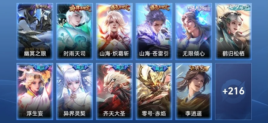 夏洛特-浮生妄,虞姬-啟明星使,曜-山海·蒼雷引,孫悟空-齊天大聖,孫悟空-零號·赤焰,諸葛亮-時雨天司,李信-山海·熾霜斬,曜-李逍遙,雲纓-鶴歸松棲,項羽-無限傾心,孫尚香-異界靈契