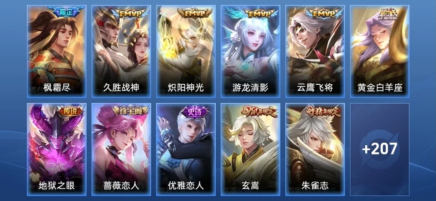 嬴政-優雅戀人,裴擒虎-李小龍,蒙恬-榮光聖徽,嫦娥-拒霜思,李元芳-匿光偵查者,花木蘭-默契交鋒,狄仁傑-魔術師,阿軻-迷蹤麗影,百里玄策-原初追逐者,楊玉環-遇見飛天,百里守約-朱雀志,干將莫邪-真愛魔法,蒙犽-百解令,周瑜-真愛至上,司空震-地獄燃心,雲中君-纖雲弄巧,蒙犽-狂想玩偶喵,鬼谷子-五穀豐年,狂鐵-電玩高手,韓信-傲雪梅槍,夢奇-頑趣,蔡文姬-奇蹟聖誕,孫尚香-薔薇戀人,周瑜-雪夜綺願,鍾無豔-超時空戰士,馬超-神威,阿古朵-江河有靈,孫臏-天狼運算者,蔡文姬-繁星吟遊,元歌-無心,趙雲-皇家上將,大喬-白鶴梁神女,老夫子-航海奇遇記,莊周-玄嵩,雅典娜-黎明之約,莊周-高山流水