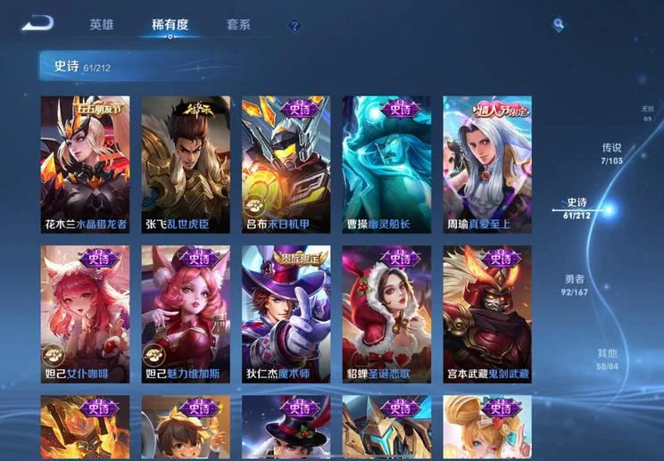 張飛-亂世虎臣,花木蘭-劍舞者,李元芳-特種部隊,豬八戒-潮玩探月行,明世隱-虹雲星官,王昭君-幻想奇妙夜,夢奇-美夢成真,關羽-天啟騎士,李信-灼熱之刃,楊玉環-霓裳曲,裴擒虎-街頭旋風,牛魔-西部大鏢客,海月-幻泉霧影,呂布-野性能量,豬八戒-年年有餘,姜子牙-熾熱元素使,狄仁傑-錦衣衛,鍾無豔-生化警戒,鏡-冰刃幻境,老夫子-潮流仙人,李元芳-妄想特派,曹操-幽靈船長,亞瑟-死亡騎士,老夫子-功夫老勺,孫悟空-西部大鏢客,劉備-潮玩造夢師,宮本武藏-永珍初新,劉邦-虎嘯劍宗,趙懷真-太極少年,墨子-金屬風暴,瀾-孤獵,亞連-破局者,趙雲-未來紀元,諸葛亮-星航指揮官,鬼谷子-阿摩司公爵,甄姬-冰雪圓舞曲,魯班大師-乓乓大師,露娜-緋紅之刃,韓信-街頭霸王,花木蘭-水晶獵龍者,孫策-海之征途,曜-歸虛夢演,白起-星夜王子,伽羅-花見巫女,孫臏-歸虛夢演,劉禪-紳士熊喵,蘭陵王-暗隱獵獸者,百里守約-絕影神槍,典韋-黃金武士,盾山-圓桌騎士,孫尚香-水果甜心,呂布-末日機甲,甄姬-花好人間,狄仁傑-鷹眼統帥,沈夢溪-鯊炮海盜貓,花木蘭-兔女郎,米萊狄-精準探案法,劉備-漢昭烈帝,周瑜-海軍大將,司馬懿-暗淵魔法,劉禪-秘密基地,明世隱-占星師,弈星-踏雪尋梅,黃忠-芝加哥教父,李白-範海辛,李元芳-逐浪之夏,扁鵲-化身博士,魯班七號-福祿兄弟,牛魔-制霸全明星,趙雲-忍·炎影,百里玄策-威尼斯狂歡,阿古朵-熊喵少女,西施-歸虛夢演,雲纓-赤焰之纓,妲己-少女阿狸,劉禪-喚靈魔甲,司馬懿-魘語軍師,白起-白色死神,太乙真人-勁辣紅鍋,后羿-精靈王,公孫離-花間舞,魯班大師-歸虛夢演,桑啟-畫中遊,貂蟬-聖誕戀歌,嫦娥-露花倒影,馬超-倖存者,宮本武藏-未來紀元,廉頗-地獄巖魂,孫臏-未來旅行,達摩-大發明家,程咬金-無雙福將,上官婉兒-修竹墨客,項羽-科學大爆炸,張飛-五福同心,墨子-進擊墨子號,司空震-啟蟄,大喬-貓狗日記,盤古-創世神祝,鬼谷子-幻樂之宴,蒙犽-歸虛夢演,姬小滿-零食大作戰,橘右京-修羅,魯班七號-木偶奇遇記,虞姬-加勒比小姐,牛魔-牛運亨通,關羽-龍騰萬里,韓信-教廷特使,馬可波羅-潮玩牛仔,蒙恬-秩序獵龍將,狂鐵-命運角鬥場,劉備-紐約教父,楊戩-次元傲視,安琪拉-時之奇旅,孫臏-天使之翼,王昭君-偶像歌手,貂蟬-異域舞娘,蔡文姬-薔薇王座,哪吒-次元突破,馬可波羅-激情綠茵,暃-碧珀緋影,妲己-魅力維加斯,張良-古海尋蹤,元歌-午夜歌劇院,楊戩-埃及法老,鍾無豔-聚星閃耀,孫尚香-沉穩之力,宮本武藏-鬼劍武藏,羋月-紅桃皇后,瑤-森,夏侯惇-戰爭騎士,鍾無豔-海灘麗影,狂鐵-特工戰影,米萊狄-契約魔法,伽羅-箭羽風息,安琪拉-玩偶對對碰,大喬-伊勢巫女,鎧-龍域領主,呂布-聖誕狂歡,小喬-丁香結,妲己-女僕咖啡,蒙恬-蔚藍守將,艾琳-流音漫舞,東皇太一-東海龍王