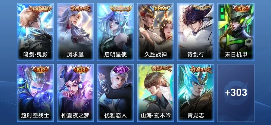 劉禪-電玩·爆裂旋風,李元芳-特種部隊,豬八戒-潮玩探月行,明世隱-虹雲星官,王昭君-幻想奇妙夜,沈夢溪-棒球奇才,張良-幽蘭居士,哪吒-三太子,李信-灼熱之刃,楊玉環-霓裳曲,大喬-守護之力,裴擒虎-街頭旋風,牛魔-西部大鏢客,海月-幻泉霧影,豬八戒-年年有餘,姜子牙-熾熱元素使,鍾無豔-生化警戒,老夫子-潮流仙人,戈婭-危途狂花,程咬金-星際陸戰隊,李元芳-妄想特派,曹操-幽靈船長,亞瑟-死亡騎士,老夫子-功夫老勺,亞瑟-心靈戰警,孫悟空-西部大鏢客,劉邦-虎嘯劍宗,雲中君-荷魯斯之眼,百里守約-特工魅影,亞連-破局者,趙雲-未來紀元,諸葛亮-星航指揮官,甄姬-冰雪圓舞曲,韓信-街頭霸王,韓信-白龍吟,白起-星夜王子,孫臏-歸虛夢演,典韋-黃金武士,武則天-東方不敗,孫尚香-水果甜心,曹操-死神來了,甄姬-花好人間,劉邦-聖殿之光,花木蘭-兔女郎,魯班七號-黑桃隊長,劉備-漢昭烈帝,雅典娜-冰冠公主,諸葛亮-黃金分割率,劉禪-秘密基地,黃忠-芝加哥教父,弈星-踏雪尋梅,阿軻-節奏熱浪,李元芳-逐浪之夏,扁鵲-化身博士,蘇烈-愛與和平,牛魔-制霸全明星,阿古朵-熊喵少女,雲纓-赤焰之纓,王昭君-精靈公主,妲己-少女阿狸,白起-白色死神,太乙真人-勁辣紅鍋,公孫離-花間舞,魯班大師-歸虛夢演,鎧-曙光守護者,嫦娥-露花倒影,小喬-繽紛獨角獸,馬超-倖存者,宮本武藏-霸王丸,達摩-大發明家,程咬金-無雙福將,張飛-五福同心,盤古-創世神祝,小喬-青蛇,安琪拉-心靈駭客,虞姬-加勒比小姐,關羽-龍騰萬里,露娜-哥特玫瑰,魯班七號-電玩小子,楊戩-次元傲視,蔡文姬-薔薇王座,馬可波羅-激情綠茵,李白-敏銳之力,張良-繽紛繪卷,張良-古海尋蹤,達摩-拳王,鍾無豔-聚星閃耀,莊周-鯉魚之夢,夏侯惇-乘風破浪,張良-千籌問戰,程咬金-愛與正義,瑤-森,夏侯惇-戰爭騎士,廉頗-無盡征程,典韋-鐵甲之心,伽羅-箭羽風息,安琪拉-玩偶對對碰,大喬-伊勢巫女,鎧-龍域領主,小喬-丁香結,蒙恬-蔚藍守將,艾琳-流音漫舞,張飛-亂世虎臣,劉邦-德古拉伯爵,夢奇-美夢成真,高漸離-金屬狂潮,呂布-野性能量,狄仁傑-錦衣衛,鏡-冰刃幻境,萊西奧-西部遊俠,曹操-超能戰警,蔡文姬-舞動綠茵,劉備-潮玩造夢師,宮本武藏-永珍初新,趙懷真-太極少年,安琪拉-如懿,墨子-金屬風暴,瀾-孤獵,蒙犽-胡桃狂想曲,程咬金-功夫廚神,娜可露露-晚螢,鬼谷子-阿摩司公爵,魯班大師-乓乓大師,露娜-緋紅之刃,扁鵲-救世之瞳,趙雲-白執事,花木蘭-水晶獵龍者,孫策-海之征途,曜-歸虛夢演,伽羅-花見巫女,阿軻-愛心護理,劉禪-紳士熊喵,蘭陵王-暗隱獵獸者,百里守約-絕影神槍,盾山-圓桌騎士,呂布-末日機甲,狄仁傑-鷹眼統帥,沈夢溪-鯊炮海盜貓,諸葛亮-掌控之力,姜子牙-時尚教父,嬴政-搖滾巨星,李白-範海辛,蘇烈-堅韌之力,露娜-瓷語鑑心,小喬-萬聖前夜,魯班七號-福祿兄弟,趙雲-忍·炎影,百里玄策-威尼斯狂歡,西施-歸虛夢演,司馬懿-魘語軍師,后羿-精靈王,桑啟-畫中遊,貂蟬-聖誕戀歌,阿軻-暗夜貓娘,廉頗-地獄巖魂,孫臏-未來旅行,露娜-紫霞仙子,白起-樂園追獵者,項羽-科學大爆炸,金蟬-前塵,墨子-進擊墨子號,大喬-貓狗日記,司空震-啟蟄,鬼谷子-幻樂之宴,孫策-貓狗日記,蒙犽-歸虛夢演,姬小滿-零食大作戰,橘右京-修羅,魯班七號-木偶奇遇記,牛魔-牛運亨通,劉禪-天才門將,李白-千年之狐,韓信-教廷特使,蒙恬-秩序獵龍將,莊周-奇妙博物學,項羽-蒼穹之光,狂鐵-命運角鬥場,劉備-紐約教父,安琪拉-時之奇旅,劉備-萬事如意,孫臏-天使之翼,干將莫邪-第七人偶,王昭君-偶像歌手,貂蟬-異域舞娘,哪吒-次元突破,暃-碧珀緋影,公孫離-無限星賞官,妲己-魅力維加斯,元歌-午夜歌劇院,楊戩-埃及法老,孫尚香-沉穩之力,鍾馗-地府判官,嬴政-暗夜貴公子,宮本武藏-鬼劍武藏,成吉思汗-維京掠奪者,海月-王牌新星,鍾無豔-海灘麗影,后羿-阿爾法小隊,狂鐵-特工戰影,米萊狄-契約魔法,呂布-聖誕狂歡,妲己-女僕咖啡,東皇太一-東海龍王