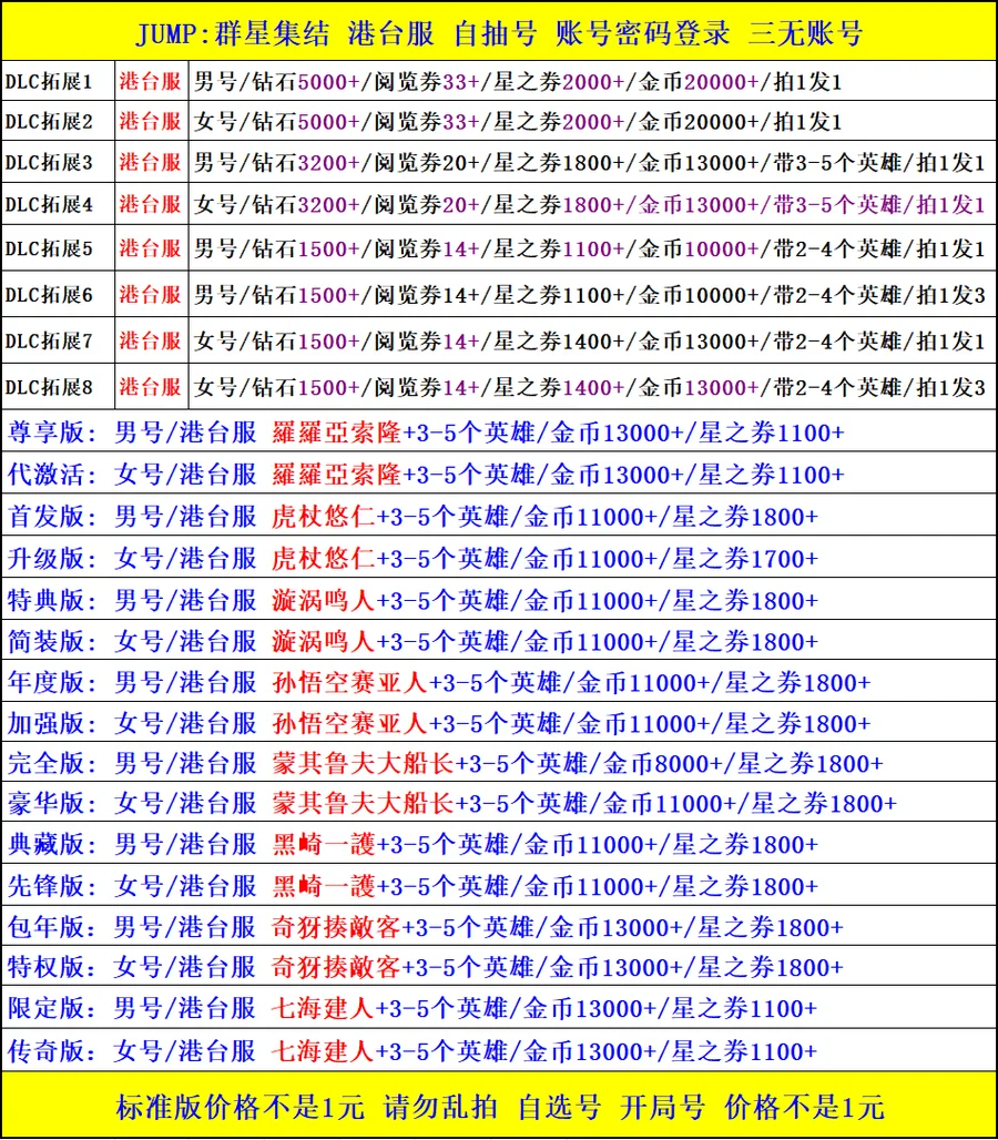 全 8591 首家 JUMP:群星集結初始號港台服石頭自選開局組合資源鑽石台服自抽號