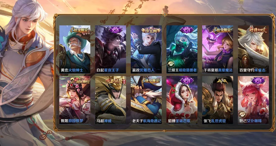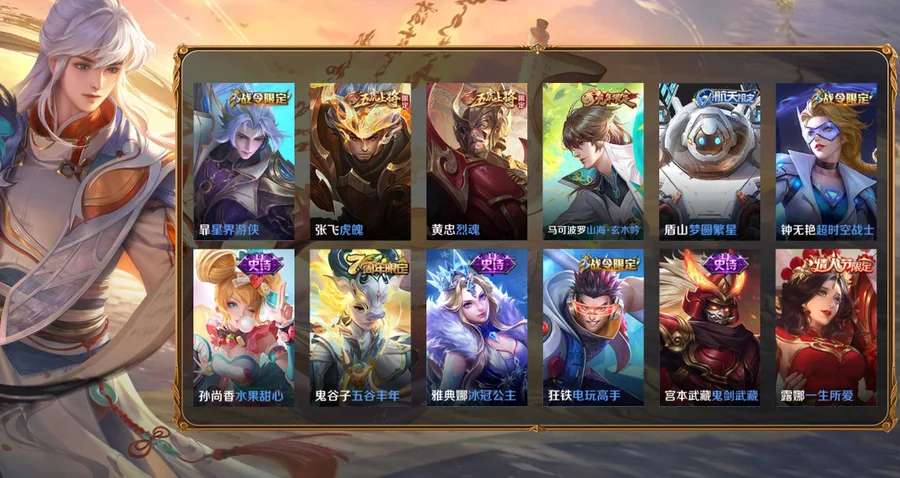 羋月-紅桃皇后,張良-古海尋蹤,王昭君-午後時光,安琪拉-玩偶對對碰,達摩-星際陸戰隊,姜子牙-熾熱元素使,墨子-進擊墨子號,孫臏-歸虛夢演,項羽-海灘派對,西施-玲瓏珍味,魯班大師-探海日誌,裴擒虎-擒濤扼浪,沈夢溪-大漠名商,蒙恬-蔚藍守將,白起-白色死神,程咬金-演武奪籌,程咬金-無雙福將,達摩-大發明家,達摩-拳王,達摩-沙漠行僧,妲己-少女阿狸,狄仁傑-陰陽師,狄仁傑-萬華元夜,典韋-黃金武士,宮本武藏-未來紀元,宮本武藏-霸王丸,鬼谷子-原初探秘者,韓信-街頭霸王,韓信-教廷特使,后羿-聖弓遊俠,老夫子-功夫老勺,老夫子-醍醐杖,劉備-紐約教父,劉備-漢昭烈帝,魯班七號-黑桃隊長,羋月-幻夜卜夢,明世隱-虹雲星官,墨子-神蹟守衛,哪吒-次元突破,牛魔-御旌,女媧-朔望之暉,沈夢溪-星空之諾,蘇烈-堅韌之力,蘇烈-千軍破陣,孫尚香-沉穩之力,王昭君-幻想奇妙夜,夏侯惇-朔風刀,小喬-丁香結,雅典娜-單詞大作戰,亞瑟-潮玩騎士王,弈星-混沌棋,張良-繽紛繪卷,甄姬-花好人間,鍾馗-神蹟守衛,鍾馗-驅儺正儀,鍾無豔-海灘麗影,周瑜-赤蓮之焰,狂鐵-命運角鬥場,姜子牙-時尚教父