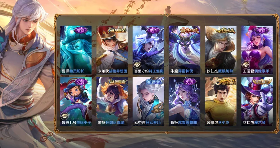 阿古朵-熊喵少女,蔡文姬-薔薇王座,曹操-死神來了,嫦娥-露花倒影,成吉思汗-維京掠奪者,大喬-伊勢巫女,狄仁傑-錦衣衛,東皇太一-東海龍王,盾山-極冰防禦線,伽羅-花見巫女,干將莫邪-第七人偶,高漸離-金屬狂潮,公孫離-花間舞,關羽-天啟騎士,后羿-精靈王,黃忠-芝加哥教父,金蟬-前塵,鏡-冰刃幻境,鎧-龍域領主,蘭陵王-隱刃,瀾-孤獵,老夫子-潮流仙人,李元芳-特種部隊,劉禪-英喵野望,魯班大師-歸虛夢演,魯班七號-福祿兄弟,馬可波羅-激情綠茵,蒙恬-秩序獵龍將,蒙犽-歸虛夢演,夢奇-美夢成真,明世隱-占星師,盤古-創世神祝,裴擒虎-街頭旋風,司馬懿-魘語軍師,孫策-海之征途,孫悟空-西部大鏢客,太乙真人-圓桌騎士,西施-歸虛夢演,夏侯惇-戰爭騎士,項羽-帝國元帥,楊戩-埃及法老,楊玉環-霓裳曲,瑤-森,曜-歸虛夢演,弈星-踏雪尋梅,虞姬-加勒比小姐,元歌-午夜歌劇院,雲纓-赤焰之纓,張良-一千零一夜,諸葛亮-星航指揮官,豬八戒-年年有餘