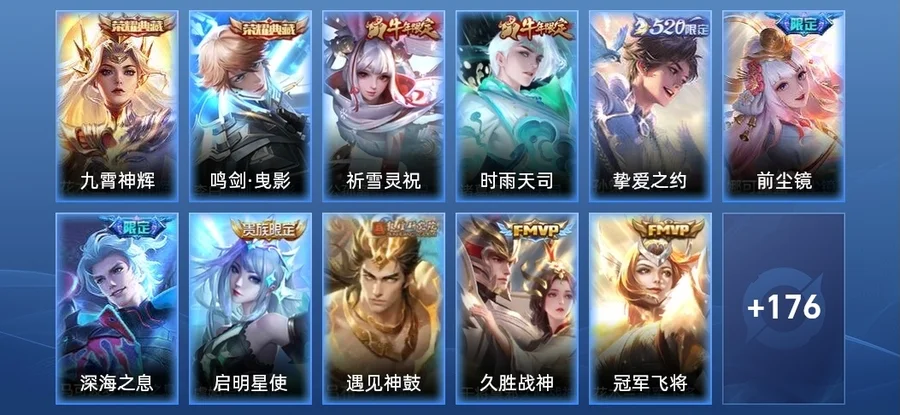 趙雲-引擎之心,鬼谷子-五穀豐年,趙懷真-鶴歸松棲,狂鐵-電玩高手,沈夢溪-匿光破解者,羋月-白晶晶,鎧-青龍志,高漸離-燃音魔法,嫦娥-拒霜思,貂蟬-逐夢之音,馬超-神威,阿古朵-江河有靈,李元芳-匿光偵查者,狄仁傑-魔術師,趙雲-皇家上將,孫悟空-至尊寶,孫悟空-孫行者,暃-星界遊俠,魯班七號-乒乒小將,關羽-冰鋒戰神,戈婭-馭風魔法,伽羅-琥珀紀元,蒙犽-百解令,司空震-地獄燃心
