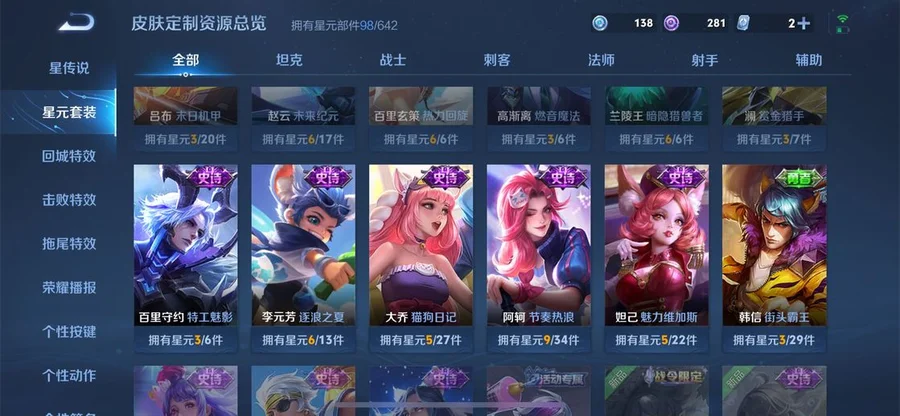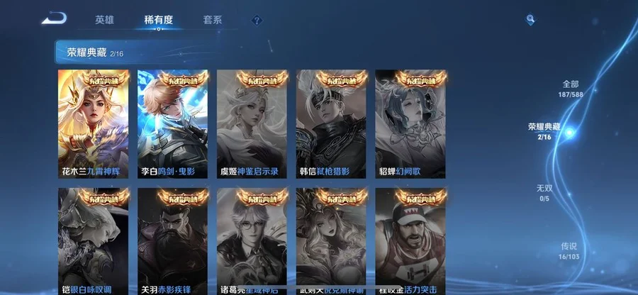 張飛-亂世虎臣,李元芳-特種部隊,豬八戒-潮玩探月行,明世隱-虹雲星官,夢奇-美夢成真,王昭君-幻想奇妙夜,哪吒-三太子,李信-灼熱之刃,楊玉環-霓裳曲,大喬-守護之力,高漸離-金屬狂潮,呂布-野性能量,姜子牙-熾熱元素使,鏡-冰刃幻境,萊西奧-西部遊俠,老夫子-潮流仙人,李元芳-妄想特派,曹操-幽靈船長,亞瑟-死亡騎士,老夫子-功夫老勺,雲中君-荷魯斯之眼,墨子-金屬風暴,瀾-孤獵,百里守約-特工魅影,程咬金-功夫廚神,亞連-破局者,趙雲-未來紀元,諸葛亮-星航指揮官,鬼谷子-阿摩司公爵,哪吒-熱血海灘,甄姬-冰雪圓舞曲,露娜-緋紅之刃,韓信-街頭霸王,曜-歸虛夢演,白起-星夜王子,孫臏-歸虛夢演,百里守約-絕影神槍,蘭陵王-暗隱獵獸者,盾山-圓桌騎士,不知火舞-魅語,孫尚香-水果甜心,呂布-末日機甲,甄姬-花好人間,劉邦-聖殿之光,狄仁傑-鷹眼統帥,花木蘭-兔女郎,米萊狄-精準探案法,劉備-漢昭烈帝,諸葛亮-掌控之力,姜子牙-時尚教父,嬴政-搖滾巨星,司馬懿-暗淵魔法,弈星-踏雪尋梅,阿軻-節奏熱浪,蘇烈-堅韌之力,露娜-瓷語鑑心,扁鵲-化身博士,李元芳-逐浪之夏,瀾-賞金獵手,蘇烈-愛與和平,趙雲-忍·炎影,百里玄策-威尼斯狂歡,阿古朵-熊喵少女,妲己-少女阿狸,雲纓-赤焰之纓,司馬懿-魘語軍師,白起-白色死神,太乙真人-勁辣紅鍋,后羿-精靈王,公孫離-花間舞,桑啟-畫中遊,貂蟬-聖誕戀歌,萊西奧-末日機甲,馬超-倖存者,廉頗-地獄巖魂,白起-樂園追獵者,盾山-極冰防禦線,達摩-大發明家,張飛-五福同心,大喬-貓狗日記,司空震-啟蟄,盤古-創世神祝,百里玄策-熱力迴旋,鬼谷子-幻樂之宴,小喬-青蛇,蒙犽-歸虛夢演,橘右京-修羅,虞姬-加勒比小姐,牛魔-牛運亨通,劉禪-天才門將,李白-千年之狐,韓信-教廷特使,關羽-龍騰萬里,蒙恬-秩序獵龍將,狂鐵-命運角鬥場,張良-一千零一夜,夏洛特-永晝,干將莫邪-第七人偶,孫臏-天使之翼,王昭君-偶像歌手,蔡文姬-薔薇王座,馬可波羅-激情綠茵,妲己-魅力維加斯,雅典娜-戰爭女神,張良-古海尋蹤,達摩-拳王,元歌-午夜歌劇院,楊戩-埃及法老,鍾無豔-聚星閃耀,夏侯惇-乘風破浪,宮本武藏-鬼劍武藏,羋月-紅桃皇后,瑤-森,海月-王牌新星,項羽-帝國元帥,狂鐵-特工戰影,安琪拉-玩偶對對碰,鎧-龍域領主,小喬-丁香結,蒙恬-蔚藍守將,艾琳-流音漫舞,東皇太一-東海龍王