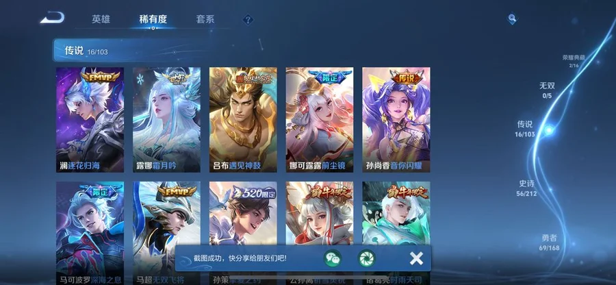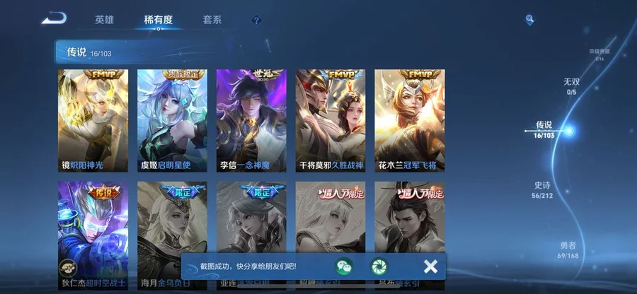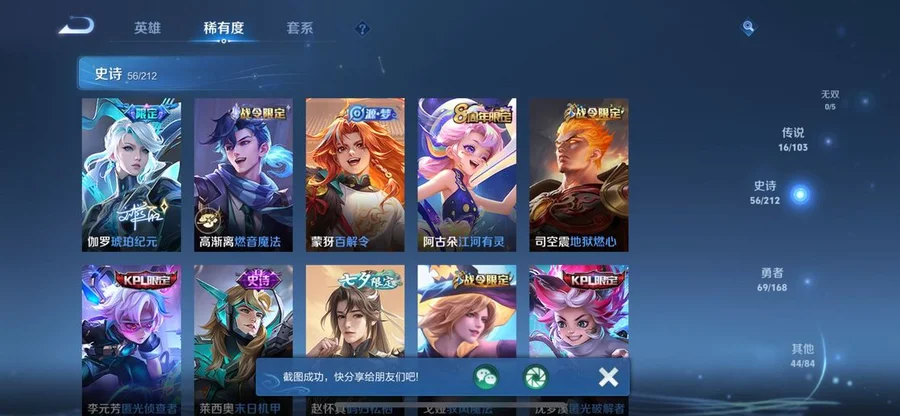 阿軻,魯班七號,盤古,米萊狄,大喬,東皇太一,韓信,豬八戒,亞瑟,西施,李元芳,女媧,孫策,貂蟬,弈星,夏侯惇,程咬金,扁鵲,蔡文姬,狄仁傑,小喬,狂鐵,露娜,楊玉環,盾山,明世隱,張良,司馬懿,鍾無豔,成吉思汗,趙懷真,花木蘭,安琪拉,孫臏,蒙犽,夏洛特,牛魔,鏡,虞姬,李信,蘭陵王,哪吒,元歌,典韋,艾琳,甄姬,劉禪,雅典娜,干將莫邪,夢奇,鬼谷子,阿古朵,海諾,莊周,妲己,項羽,瑤,達摩,后羿,海月,馬可波羅,暃,呂布,劉邦,馬超,金蟬,亞連,司空震,黃忠,羋月,白起,太乙真人,娜可露露,瀾,關羽,墨子,百里守約,老夫子,趙雲,魯班大師,伽羅,張飛,朵莉亞,諸葛亮,孫悟空,上官婉兒,姜子牙,孫尚香,雲纓,裴擒虎,不知火舞,姬小滿,萊西奧,楊戩,蘇烈,鍾馗,高漸離,廉頗,公孫離,曜,鎧,李白,蒙恬,劉備,王昭君,橘右京,沈夢溪,百里玄策,雲中君,戈婭,桑啟,嫦娥,敖隱,宮本武藏,曹操,周瑜