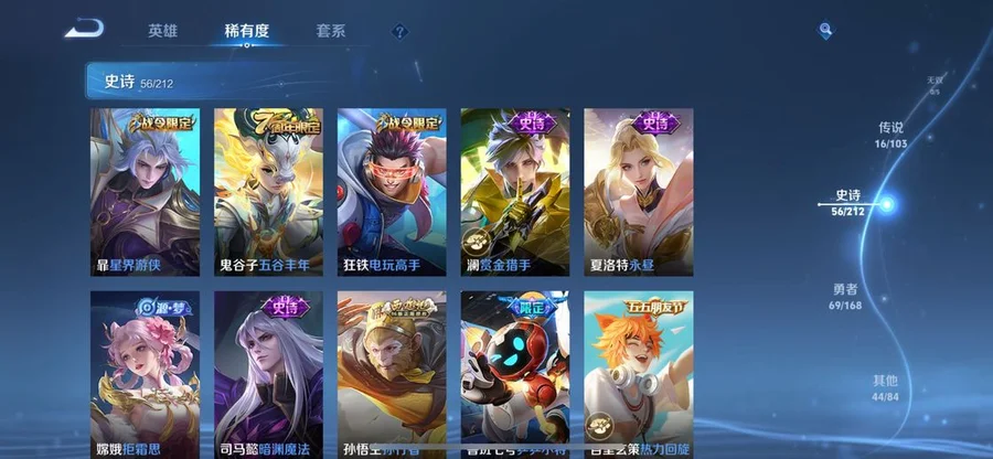 趙雲-引擎之心,鬼谷子-五穀豐年,趙懷真-鶴歸松棲,狂鐵-電玩高手,沈夢溪-匿光破解者,羋月-白晶晶,鎧-青龍志,高漸離-燃音魔法,嫦娥-拒霜思,貂蟬-逐夢之音,馬超-神威,阿古朵-江河有靈,李元芳-匿光偵查者,狄仁傑-魔術師,趙雲-皇家上將,孫悟空-至尊寶,孫悟空-孫行者,暃-星界遊俠,魯班七號-乒乒小將,關羽-冰鋒戰神,戈婭-馭風魔法,伽羅-琥珀紀元,蒙犽-百解令,司空震-地獄燃心