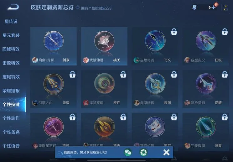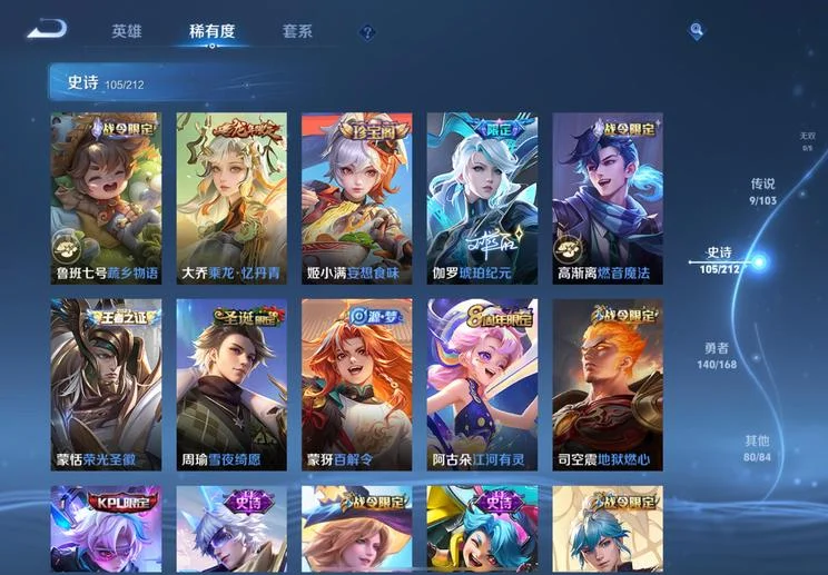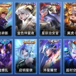 裴擒虎-李小龍,明世隱-吟遊魔法,廉頗-寅虎·御盾,嫦娥-拒霜思,李元芳-匿光偵查者,米萊狄-胡桃異想國,項羽-霸王別姬,蘭陵王-馴魔獵人,孫悟空-至尊寶,魯班七號-蔬鄉物語,百里玄策-原初追逐者,魯班七號-乒乒小將,戈婭-馭風魔法,露娜-一生所愛,伽羅-琥珀紀元,雲中君-纖雲弄巧,鬼谷子-五穀豐年,狂鐵-電玩高手,元歌-雲間偶戲,孫尚香-薔薇戀人,鍾無豔-超時空戰士,周瑜-雪夜綺願,后羿-如夢令,蔡文姬-繁星吟遊,上官婉兒-梁祝,元歌-無心,李元芳-銀河之約,暃-星界遊俠,老夫子-航海奇遇記,雅典娜-黎明之約,孫悟空-大聖娶親,蒙恬-榮光聖徽,扁鵲-奇幻香蹤,高漸離-燃音魔法,上官婉兒-天狼繪夢者,呂布-御風驍將,狄仁傑-魔術師,阿軻-迷蹤麗影,孫悟空-孫行者,楊玉環-遇見飛天,姬小滿-妄想食味,虞姬-霸王別姬,干將莫邪-真愛魔法,蒙犽-百解令,馬可波羅-逐夢之星,蒙犽-狂想玩偶喵,司空震-地獄燃心,馬可波羅-暗影遊獵,妲己-時之奇旅,韓信-逐夢之影,韓信-傲雪梅槍,典韋-岱宗,大喬-乘龍·憶丹青,夢奇-頑趣,伽羅-天狼溯光者,阿古朵-江河有靈,馬可波羅-山海·玄木吟,妲己-時之彼端,黃忠-火炮紳士,莊周-高山流水