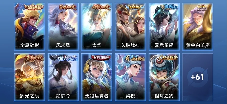 孫尚香-時之戀人,韓信-白龍吟,李白-敏銳之力,曜-歸虛夢演,白起-星夜王子,公孫離-無限星賞官,王昭君-幻想奇妙夜,孫臏-歸虛夢演,盾山-圓桌騎士,不知火舞-魅語,夏侯惇-乘風破浪,曹操-死神來了,瑤-遇見神鹿,狄仁傑-鷹眼統帥,魯班七號-黑桃隊長,米萊狄-精準探案法,鏡-冰刃幻境,司空震-啟蟄,劉備-漢昭烈帝,諸葛亮-掌控之力,雅典娜-冰冠公主,姜子牙-時尚教父,曹操-幽靈船長,蒙犽-歸虛夢演,宮本武藏-永珍初新,阿軻-節奏熱浪,瀾-孤獵,大喬-伊勢巫女,安琪拉-玩偶對對碰,露娜-哥特玫瑰,呂布-聖誕狂歡,楊戩-次元傲視,程咬金-功夫廚神,露娜-瓷語鑑心,李元芳-逐浪之夏,妲己-女僕咖啡,阿古朵-熊喵少女,娜可露露-晚螢